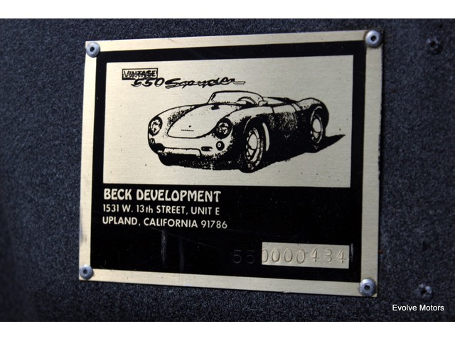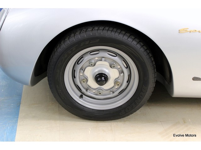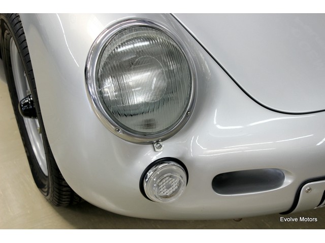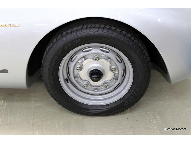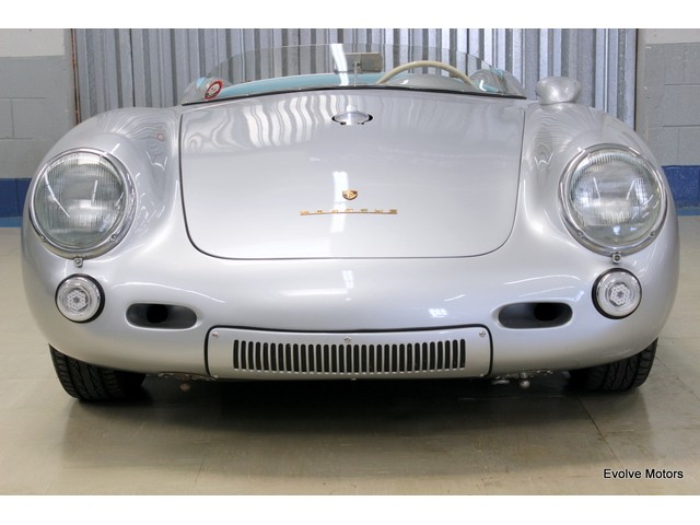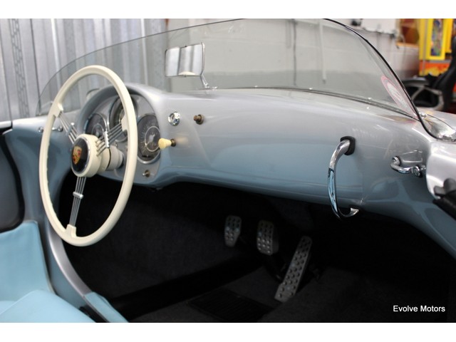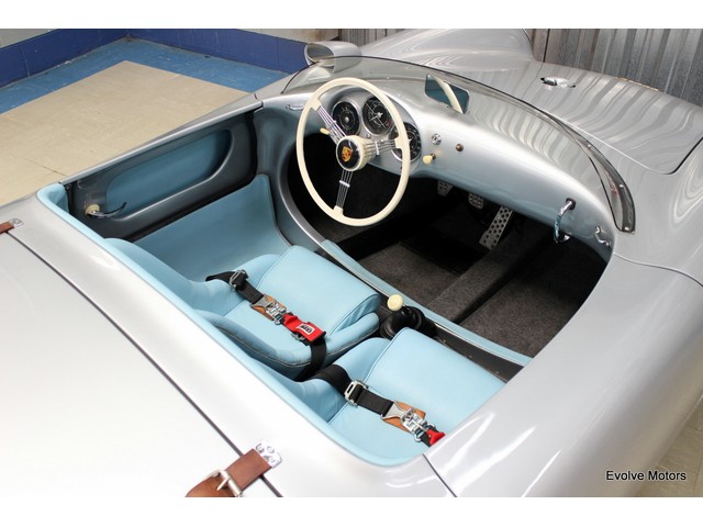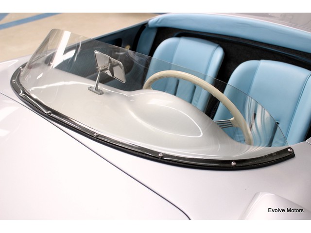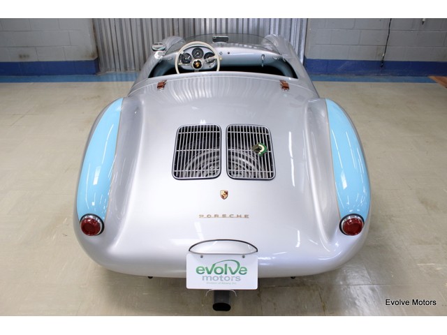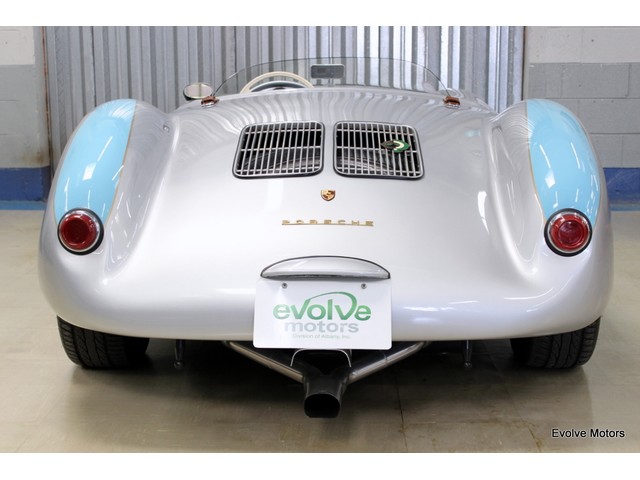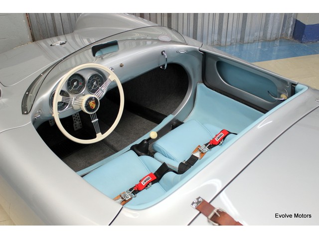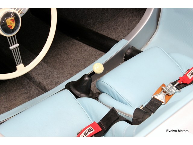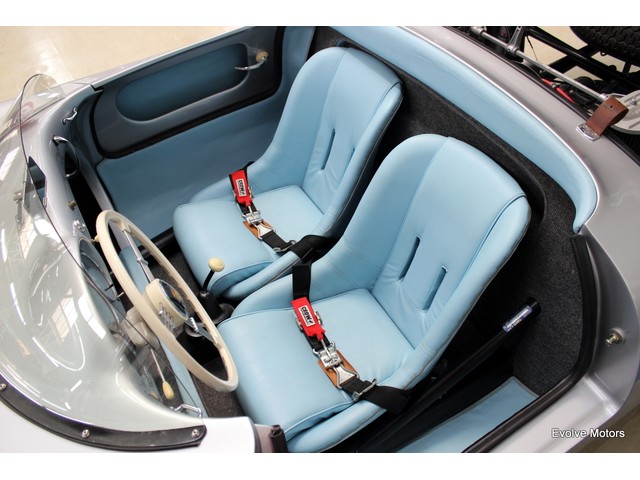 Formerly owned by a friend of Jay Leno's, this California 550 has been blessed by the best. Built well, but similar to other cars Chuck Beck was producing, our 550 was later worked on by some of the best in the business. Car number 484 (B) is finished in the iconic Silver paint and complemented by the baby blue “darts”, modeled after the 550 Spyder that Jerry Seinfeld owns. The color combination is striking, offset by the gold pin striping that surrounds the blue darts. When it comes to making these Spyders your own, the possibilities are endless. The previous owner sourced original style 550 turn signal lenses, side view mirror with faring, license plate cover, leather clam straps, Wendler badges, and Porsche scripts & crests which all make for an authentic feel. The paintwork is exceptional from front to back, showing little to no blemishes. The interior on this 550 is equally as nice and features an original style, basket weave material that matches the baby blue darts and the seats are original style 550 sport seats that have plenty of room to spare, thanks to the recessed firewall. The steering wheel is a real Porsche Banjo steering wheel and correct Porsche center crest.