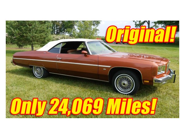 Beautiful unrestored original 1975 Chevrolet Caprice classic convertible with only 24,069 actual miles. It was owned by one family since new and comes with the original window sticker, owners manual, and other factory paperwork and receipts. The original Medium Orange Metallic paint is excellent and the Dark Saddle cloth seats, carpet, door panels and dash pad all show like new. It is powered by the original 350 V8 2 BBL engine and 3 speed automatic transmission that is ready to cruise anywhere! Additional features include power front disc brakes, power steering, comfortron air conditioning, six way power seat, power door locks, power windows, power trunk opener, AM/FM stereo (working), twin sport mirrors, 50/50 reclining passenger seat, visor vanity mirror, tilt, cruise, highway axle ratio, and much more. The original power white soft top is in excellent condition. It has always been well maintained and stored indoors - runs and drives excellent!