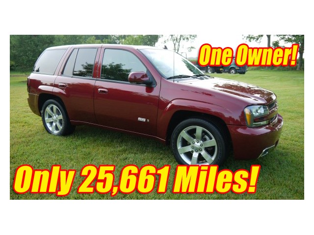 Rare one owner 2008 Chevrolet Trailblazer SS with only 25,661 actual miles and in exceptional condition! The Magnetic Red exterior paint shows like new and the custom graphite leather interior shows excellent. The aluminum block and head port fuel injection 6.0 liter produces 395 h.p. and is connected to the 4 speed automatic transmission. Features include power moon roof, navigation, rear DVD player, air, heated seats, tilt, cruise control, power windows, power seats, power locks, 20" aluminum wheels, 4 wheel disc brakes, power steering, and many more! Meticulously maintained and always stored indoors! Included in the sale are the manuals, two sets of keys, and a clean vehicle history report. Must see and drive - LOW LOW miles!!!