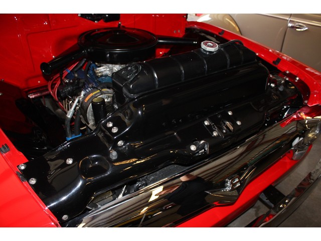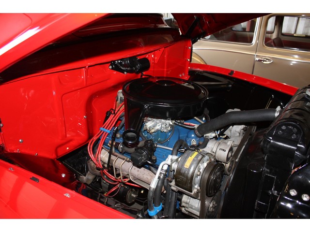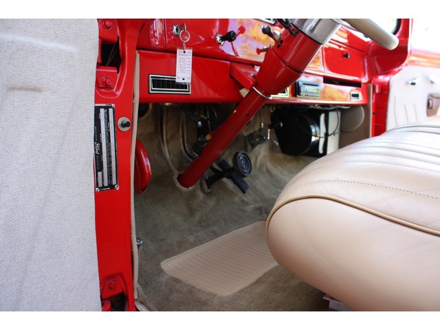 A painted tilt steering column not only looks great, but provides a base for the billet leather-wrapped steering wheel with FORD center button and functional horn, the tilt mechanism for the steering column, cruise control switchgear, and the chrome custom shift arm with clear gear selection window.