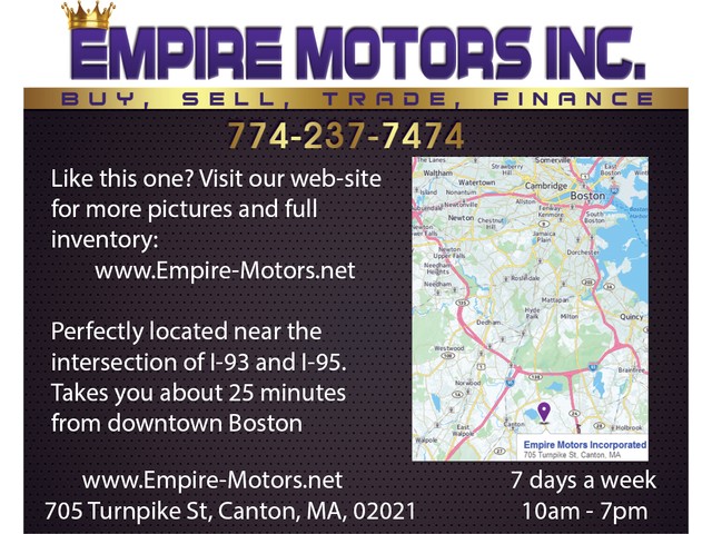 empire.motors is a registered eBay user name of Empire Motors Inc. Empire Motors is a Massachusetts Dealer operating under Massachusetts license number 11. Empire Motors is located at 705 Turnpike St, Canton, MA, 02021. Empire Motors's office can be reached at 1-774-237-7474. Visit us 10 am to 7 pm or till 9 pm by appointment! 7 days a week!