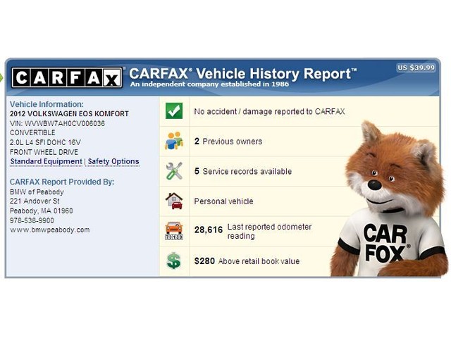 You are bidding on a very clean, well maintained 2012 VW EOS convertible with 28,616 miles that has a clean Carfax report.  Nicely equipped from the factory with an automatic transmission, 200 horsepower 4 cylinder fuel efficient engine, electronic stability control, touch screen radio, Bluetooth, heated front seats, Sirius radio, including many more!  If you have been looking for a clean, well running, closely taken care of VW EOS convertible this is just the one to fit your needs.  This car needs nothing to pass state inspection so please feel free to call or email if you would like to end the auction early.  Other than a few very light scratches this car has no issues or stories!
