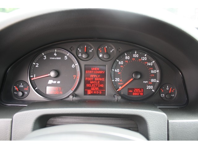 The vehicle is powered by a 4.2L V8 DOHC 32V turbo charged engine, which runs very strong and smooth. The automatic transmission shifts perfectly into every gear and is noise free. The suspension on the vehicle is tight and drives smooth on the road. The brakes work very well; with excellent stopping ability. All power options and vehicle functions work excellent. There are no maintenance lights on in this vehicle. The wheels are 18" RS6 wheels. The wheels are in good condition and have some curbing on them. The Continental tires have about 7/32 tread left all the way around. (Tire size: 255/40ZR18).