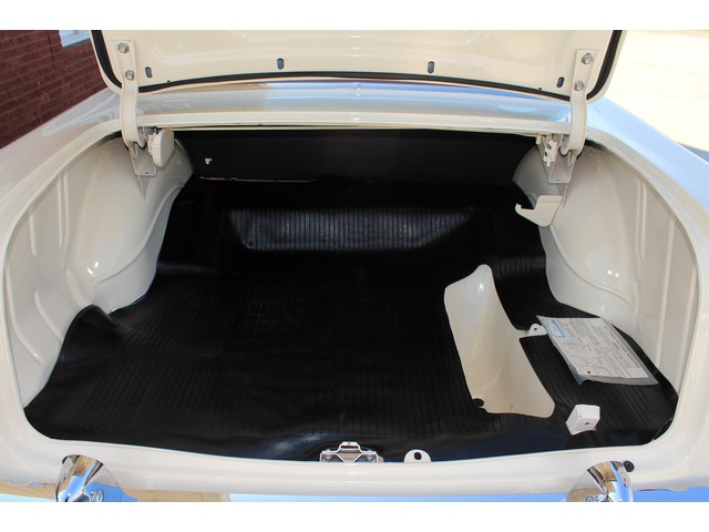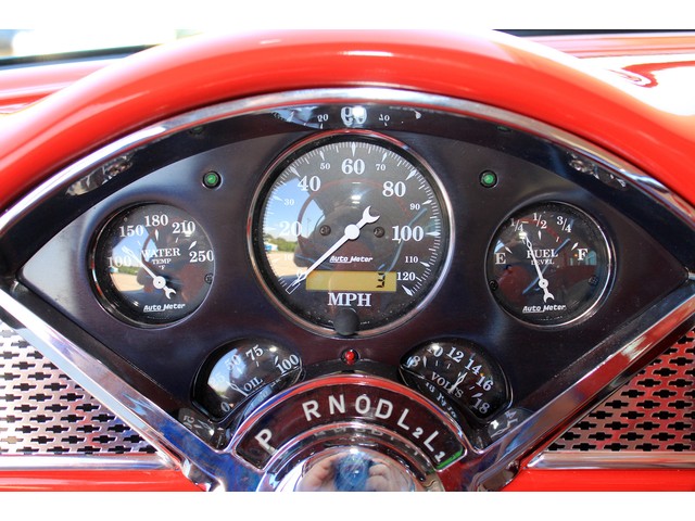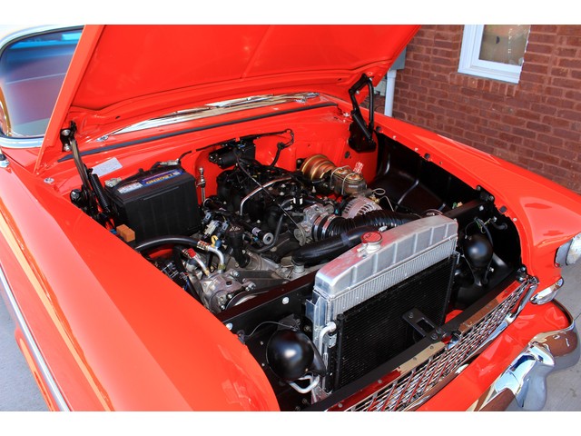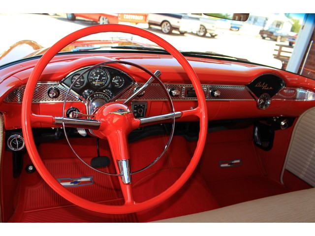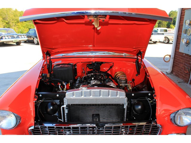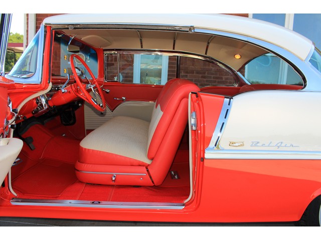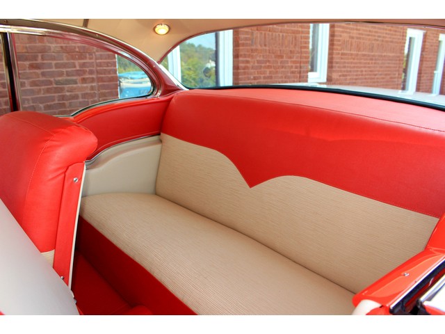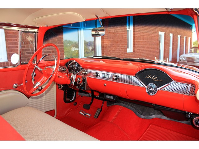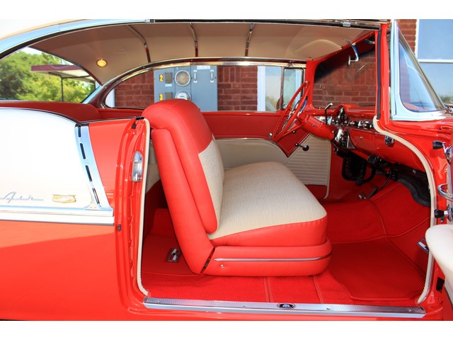 Next, we will take a look at the interior of the ’55. Everything on the inside follows suite with the exterior, it’s all new. All the metal trim and dash is painted in the Gypsy Red to flow the exterior and interior together perfectly. The seats and door panels are done in the correct covers. The dash has had a few upgrades with new instruments to work with the LS Power. They installed an after market vintage Radio along with the Vintage A/C vents and controls. The stainless around the headliner is all new along with the headliner cover bows. The white headliner and red carpet are the final interior touches.