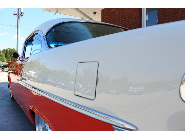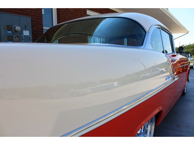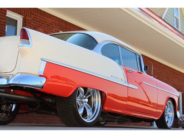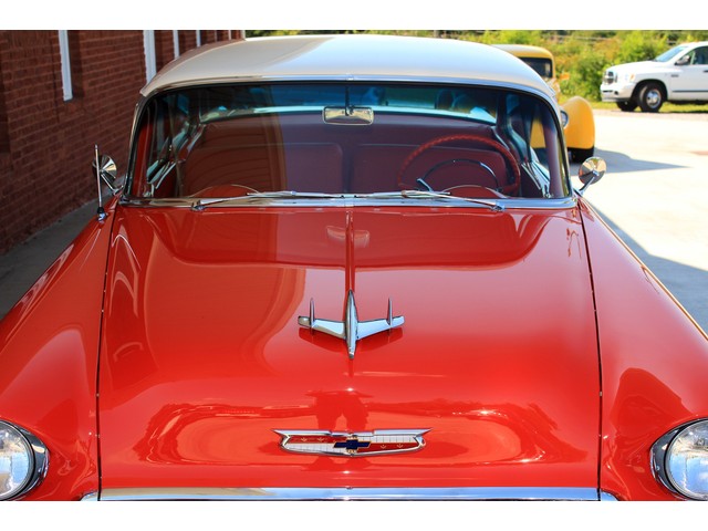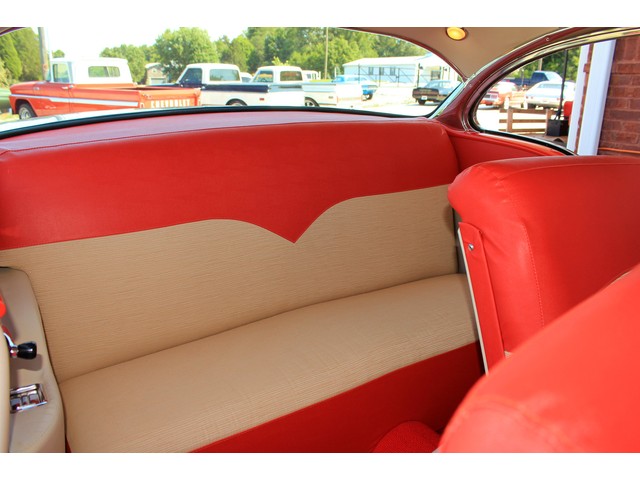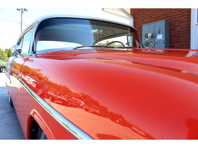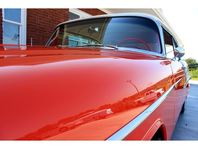 We will start off with the exterior of the Bel Air. When this car was restored no expense was spared. It was pulled off the frame and took apart and had all new panels installed with countless hours spent to ensure a good fit. It was then took back apart before being painted and then reinstalled. Everything is covered in the base coat clear coat Gypsy Red paint that is accented by the Indian Ivory. It has all been buffed and polished to a slick finish. When you look down the side you can see it has great lines with laser straight finish. All the side stainless is new as well as the window trim. All the glass looks to be new as well with new seals and window felt. Also all the chrome was replaced. This is beautiful car that is set off with a set of 18” and 20” Americans with new tires.