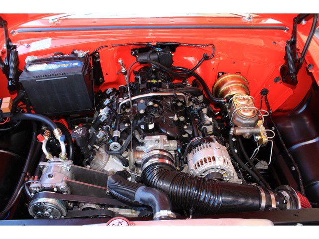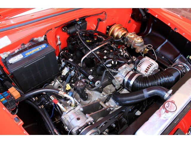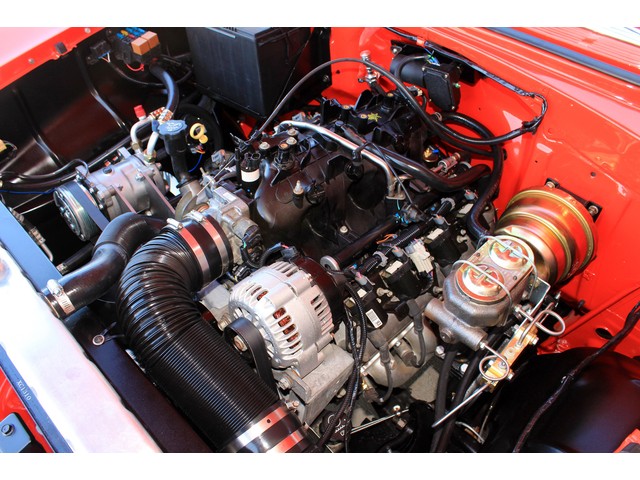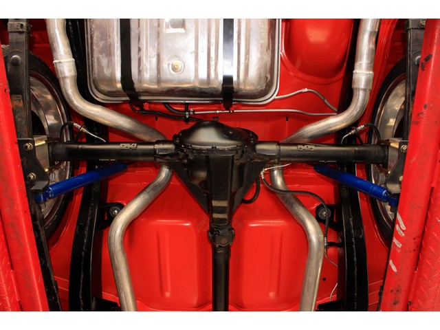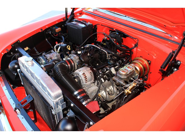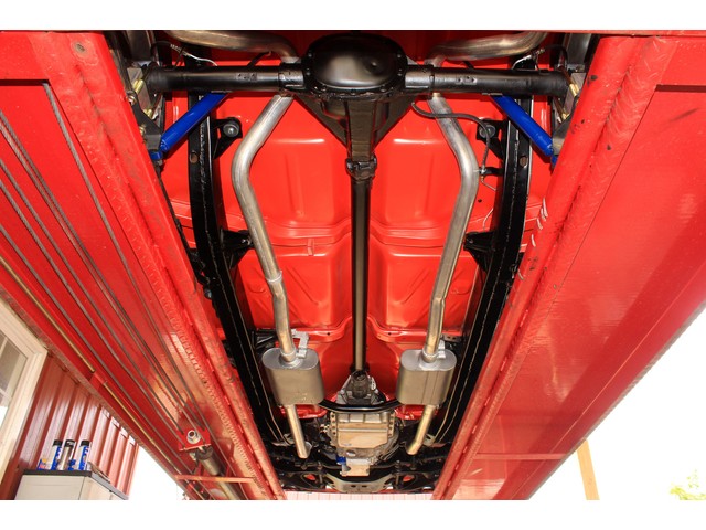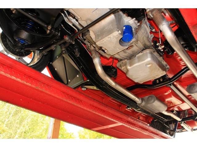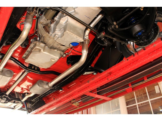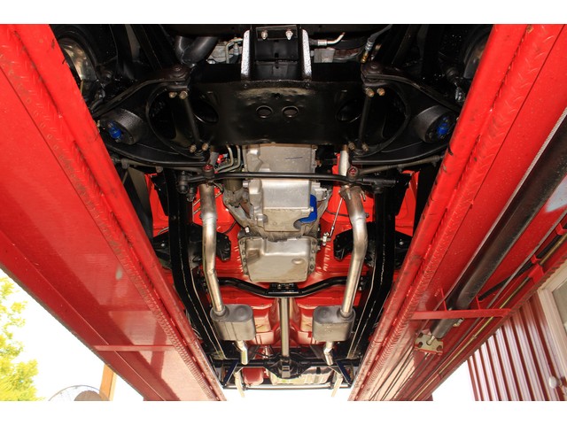Finally, we will take a look at the heartbeat of the Chevy. Under the hood it is also all new. The firewall, inner fenders, and radiator support are all painted. The power comes from a LS based V8 with fuel injection. The engine is mated to the Over Drive Trans and a 10 Bolt Rear End. Power Steering has been added along with Four Wheel Power Disc Brakes. To keep it cool it has an Aluminum radiator. Also, you will notice that they did a nice job on the vintage AC and placement of all the wires and hoses. When you look under this ’55 you can’t help but appreciate the quality and time put into it. It’s obviously been off the frame with new floor pans and body mounts being installed before being painted in Gypsy Red. The frame was pulled apart, cleaned, and painted black before all the upgrades were added.