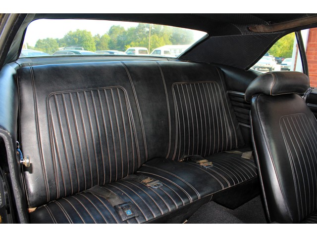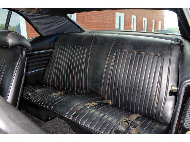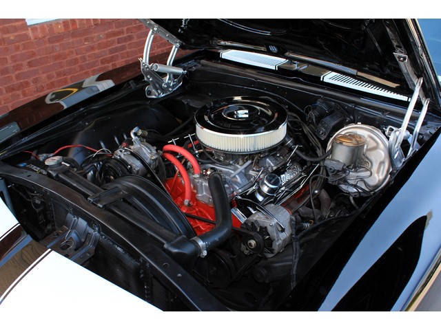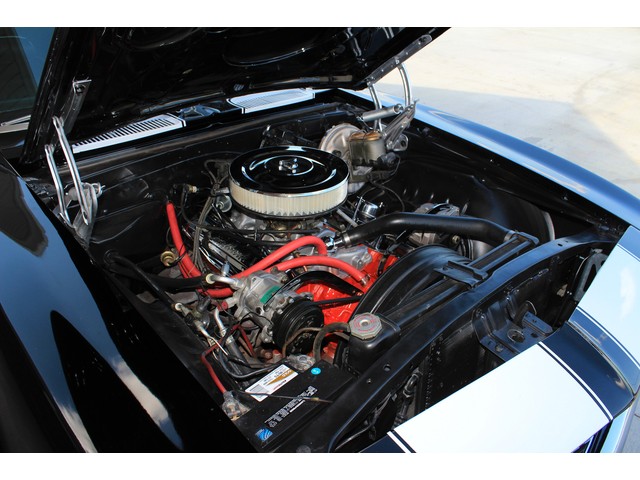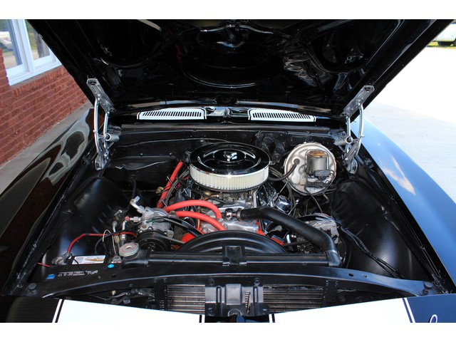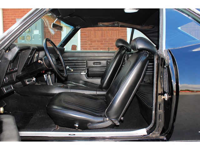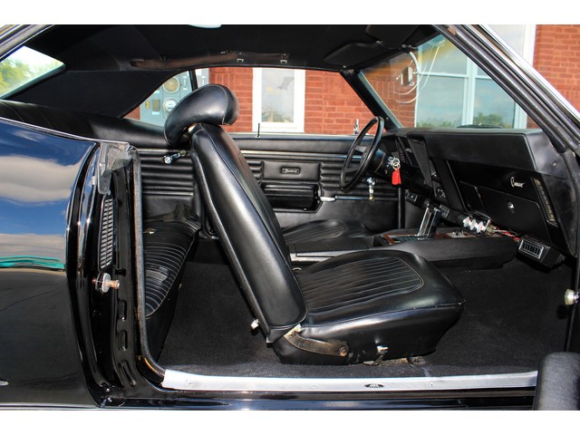 Next, we will take a look at the interior of the ’69. It’s all done in the classic black that provides the perfect transition from the exterior scheme. It has the correct bucket seats and console with the correct horse shoe shifter. The seats, carpet, and door panels all look very nice. When you look at the dash it’s correct with only an upgrade to the radio as well as a set of after market gauges. See this is an aftermarket AC system they added the vent under the dash and put the controls in the console, in front of the shifter.