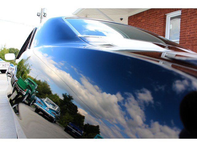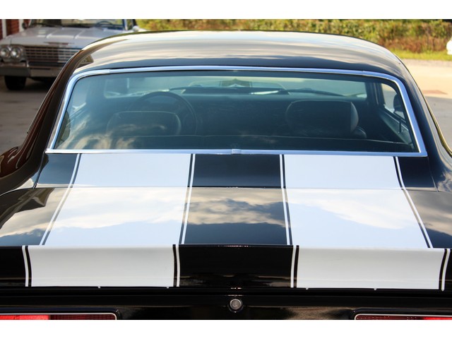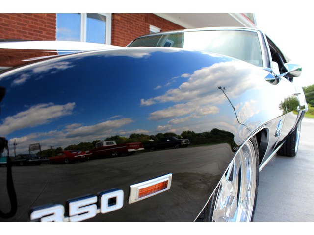 We will start off with the exterior of the Camaro. As we said it was pulled all the way apart to be painted. The body is straight and has a good fit and finish. Everything is covered in the Tuxedo Black Paint that is accented by the White Z stripes that are laid under the clean. It all shows well with a deep shine. At the time of the resto new bumpers as well as new emblems along with outside door handles were installed. They also replaced the weather stripping to ensure a good fit of the doors and trunk. The final exterior touch is the set of 18” and 20” Billet Specialties with New Tires.