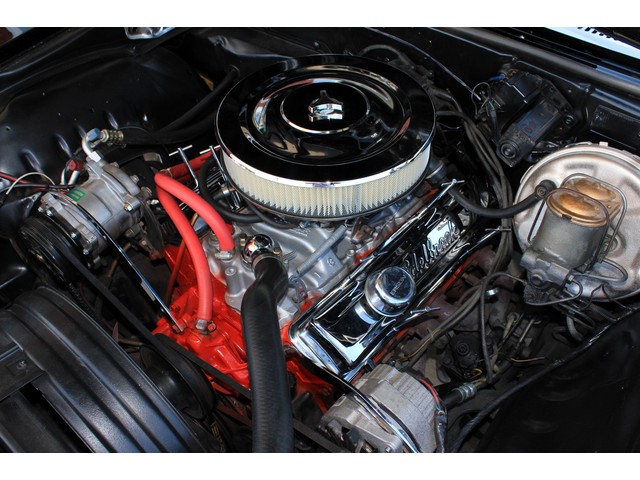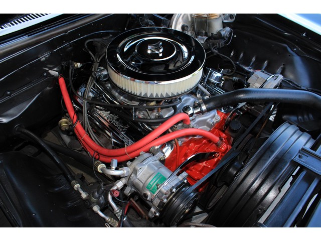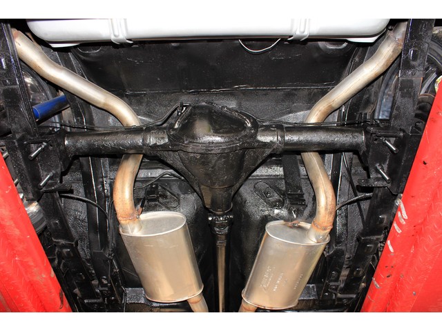 Finally, we will take a look at the heartbeat of the Chevy. It’s powered by a 350 V8 that is mated to a 350 Turbo Trans and a 10 Bolt Rear End. The engine is dressed with an aluminum intake with chrome valve covers and breather. The exhaust was changed to headers with dual Turbo Mufflers. This RS has factory Power Steering and Power Disc brakes. When you look at the AC work under the hood they did a nice job on the fit and finish. As for the bottom it all looks good. The sub frame as well as the rear frame rails all look solid.