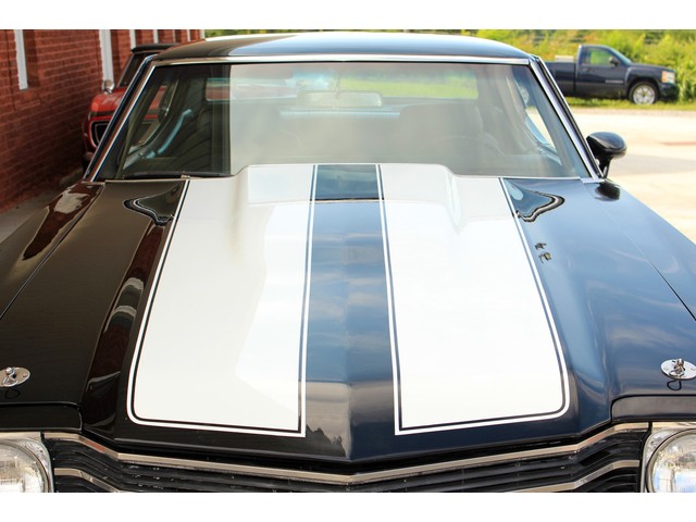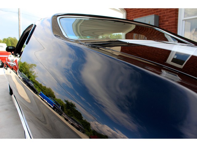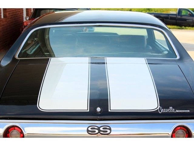 We will start off with the exterior of the Chevelle. The body looks solid with good lines and it has a 2” Steel Cowl Hood. Everything is covered in the Tuxedo Black paint that is accented by the White Stripes that are painted on and under the clean. The paint has a deep shine that is slick to the touch. The bumpers are new as well as other trim. At the time of the repaint new weather stripping was installed. All the glass looks good with the side glass working as it should. The final exterior touch is the set of 18” and 20” American Racing Wheels with new tires.