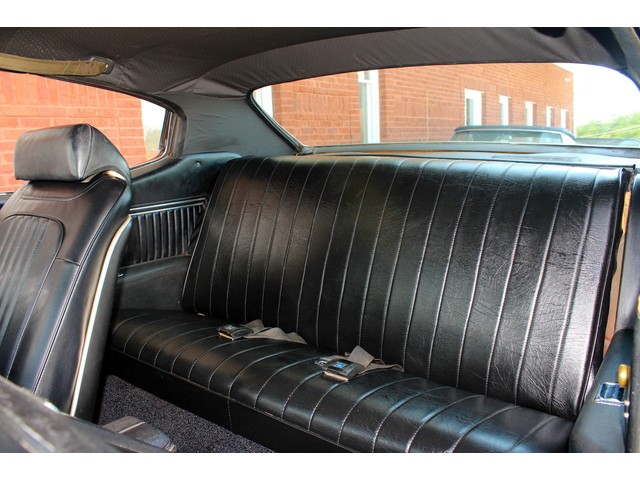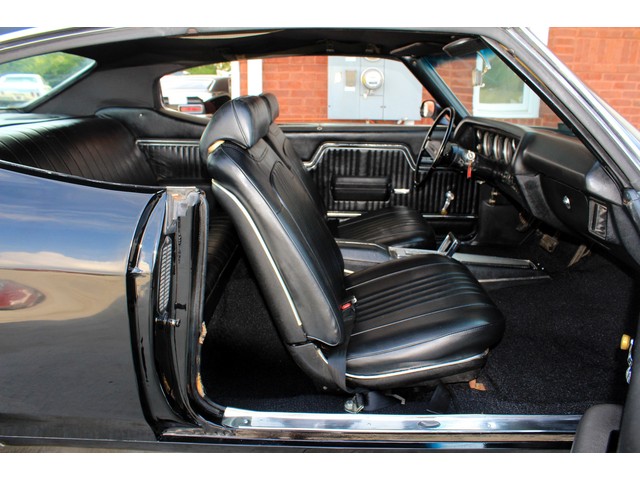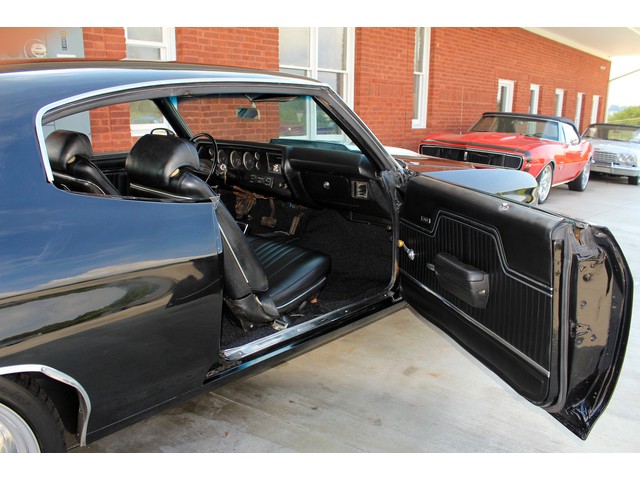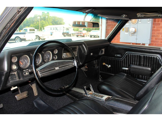 Next, we will take a look at the interior of the ’72. Everything on the inside is done in the classic black with the correct bucket seats, console, and horse shoe shifter. It has new carpet and front seat covers. They also replaced the dash pad. The door panels and headliner look good. When you look at the dash you can see it has the round gauges that were standard with the SS cars.