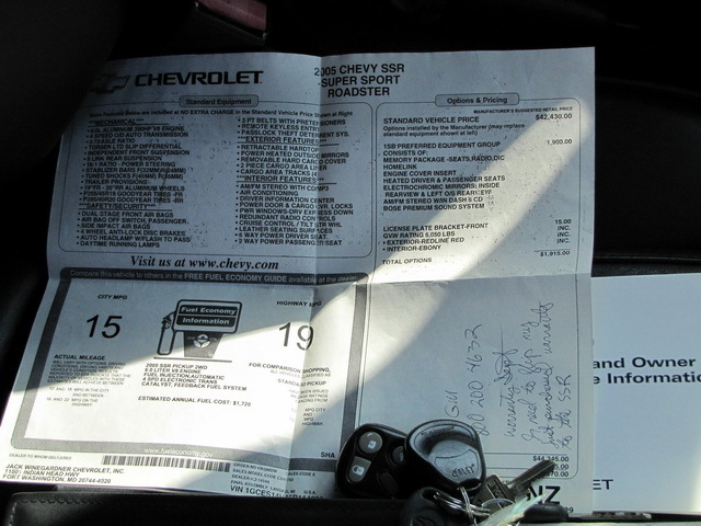 With only one previous owner, this LUXURY  CONVERTIBLE  TRUCK 2005 CHEVROLET SSR PREMIUM EDITION  is ready for you. 3 months /3000 miles POWERTRAIN WARRANTY !  JUST SERVICED ! JUST INSPECTED ( SEE PICS ) !  PREMIUM WHEELS ! THIS LUXURY CONVERTIBLE TRUCK LOADED WITH PREMIUM PACKAGE :  6.0 LITER V8 ENGINE,AUTOMATIC TRANSMISSION,POWER BRAKES,