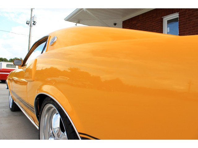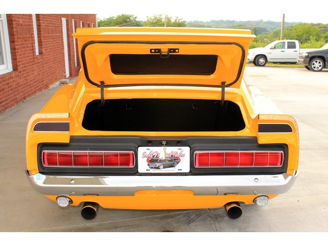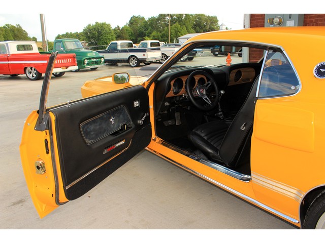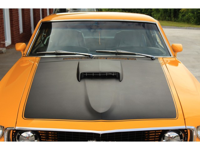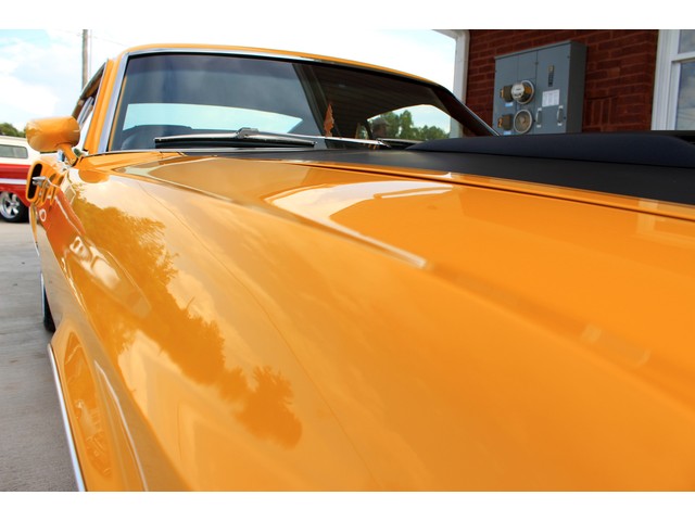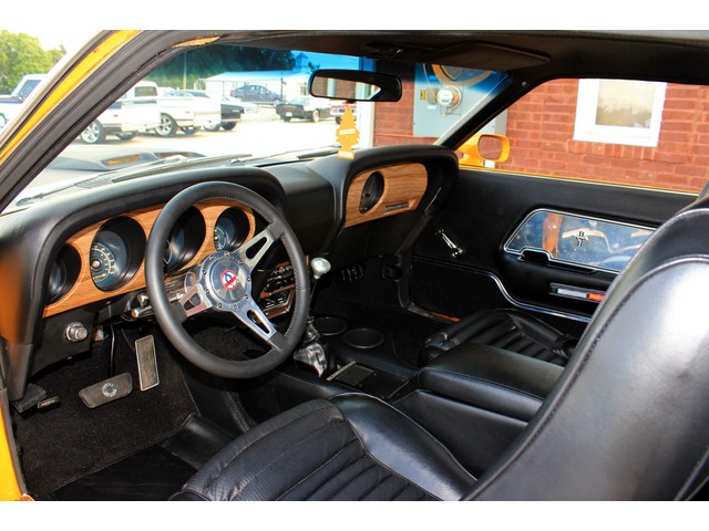 We will start off with the exterior of the Mach 1. The body is laser straight with good fit of all the panels. All the glass and stainless looks very good. At the time of th resto they installed new weather stripping and seals. They did the Shelby upgrade to the tail light and side scoops. It also has the factory style hood scoop. The bumpers were replaced as well as other chrome. When you look at the paint it’s done in the Bright Yellow with the Black inlay on the hood. It has the Black Mach 1 reflective side stripes. The paint is slick with a deep rich shine that is easy to see the hours spent on buffing and polishing. The final exterior touch is the set of 18” and 20” American Racing Wheels and Tires.