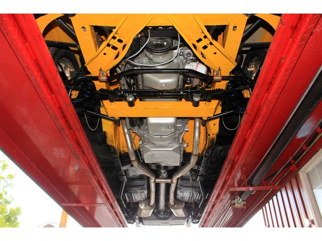 Finally, we will take a look at the driveline of the Ford. Under the hood they spent time to finish all the inner fenders and firewall and the paint it to match the body colors. It’s powered by a 302 V* that’s mated to a C6 trans. The engine is dressed with a polished intake and valve covers. The installed a chrome alternator and brackets as well as chrome pulleys. When you look under this Stang they did it right with an updated 8.8 rear end with disc brakes, frame connectors, and up front they changed the cross member to mount a power rack with tubular upper and lower control arms as well as front disc and new larger sway bar. And yes the brakes are power.