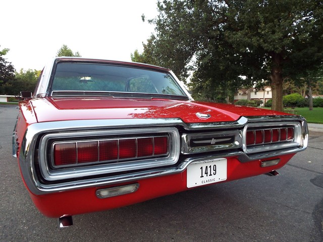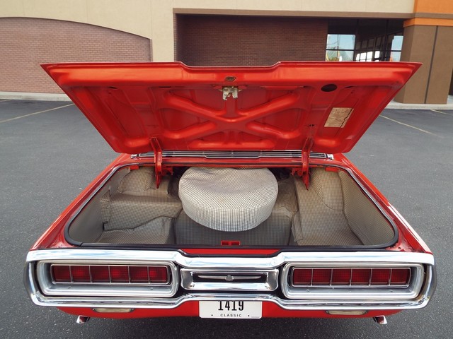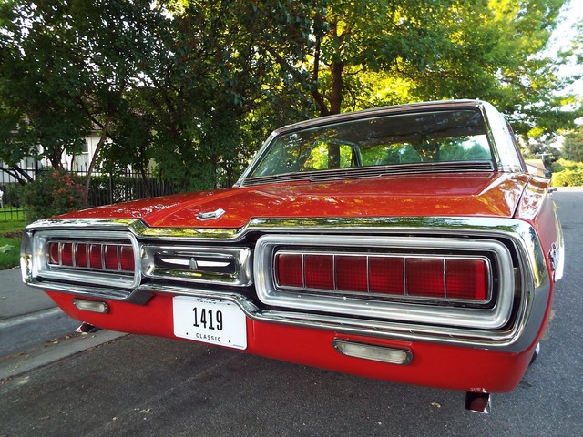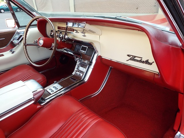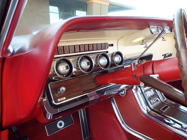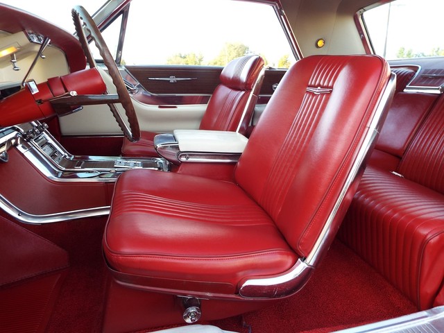 This Thunderbird has what appears to be the ORIGINAL - VERY STRONG - "GROUND POUNDING" - Code "Z" - (300 HP) - 390 CID V8 motor in it that is running very well indeed. The motor also still retains the ORIGINAL four barrel intake manifold, ORIGINAL exhaust manifolds, chrome valve covers, chrome air cleaner housing and an AutoLine 4 barrel carb. It is amazing how much power this car has, UNBELIEVABLE !! Sounds GREAT too with the factory style true dual  exhaust system with dual chrome tips !! The engine is backed by a SMOOTH - Code "4" - Dual Range three speed automatic transmission  which also functions very well. The - Code "55" - White and Red Vinyl Faux Wood Grain accented Thunderbird Landau bucket seat interior is in BEAUTIFUL condition with VERY NICE Red vinyl front bucket seats with optional passenger side reclining seat with adjustable headrest, VERY NICE ORIGINAL Faux Wood Grain accented  center console with a factory padded center armrest, VERY NICE Red vinyl rear "bucket bench" seat with factory fold down center armrest, VERY NICE matching White vinyl and faux wood grain accented door panels, VERY NICE ORIGINAL White vinyl sunvisors, VERY NICE White vinyl headliner,  VERY NICE Red carpeting, VERY NICE ORIGINAL Landau steering wheel, VERY NICE ORIGINAL White and Faux Wood Grain accented dash, VERY NICE ORIGINAL interior chrome trim, VERY NICE ORIGINAL factory gauge clusters and a VERY NICE ORIGINAL Red vinyl dash pad with NO CRACKS !! This Thunderbird is nicely equipped including