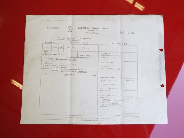 *** FACTORY ORIGINAL - DRIVER'S DOOR JAM MOUNTED THUNDERBIRD DATA PLATE - FACTORY ORIGINAL FORD REGISTERED OWNER'S IDENTIFICATION CARD - ORIGINAL FORD DEALER'S WINDOW STICKER - COPY OF ORIGINAL FACTORY BUILD SHEET - ORIGINAL DEALER PURCHASE INVOICE - COPY OF ORIGINAL MANUFACTURER'S STATEMENT OF ORIGIN TO A MOTOR VEHICLE FORM - ORIGINAL TRUNK LID MOUNTED JACKING INSTRUCTION STICKER !!  ***