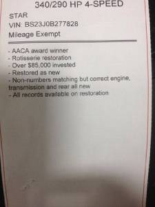 This is a matching numbers car except the engine and transmission.  They are not the original engine or transmission however, they are the correct engine and transmission for this car.  There are almost 10 years of receipts and the restoration of this car cost over $85,000. Matching numbers on fender tag, radiator support and dash plate.  Image 9 contains the Fender Tag. Here is Fender Tag Decoding information: