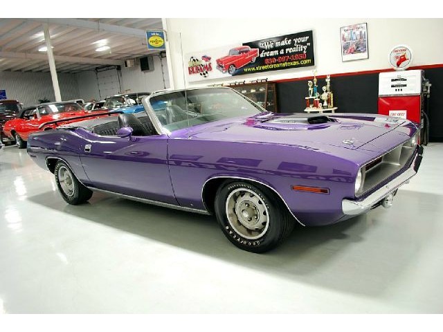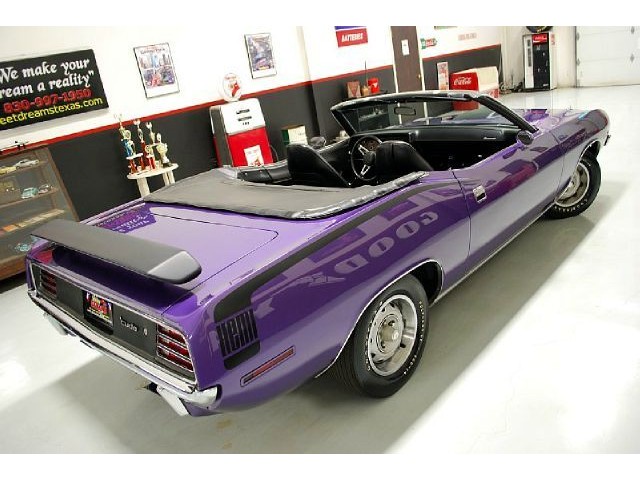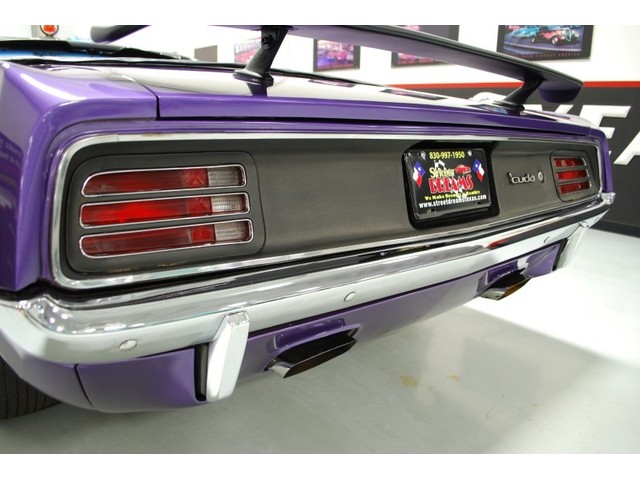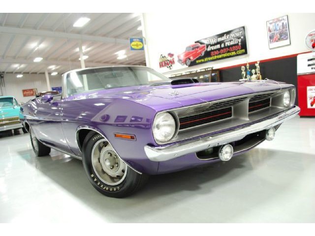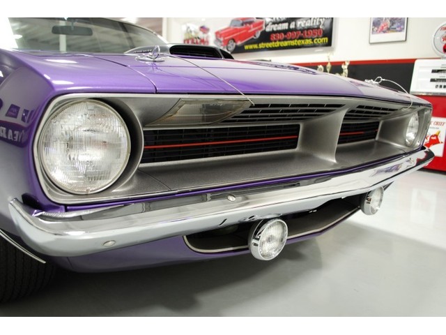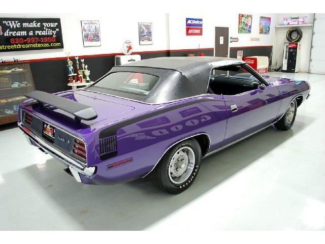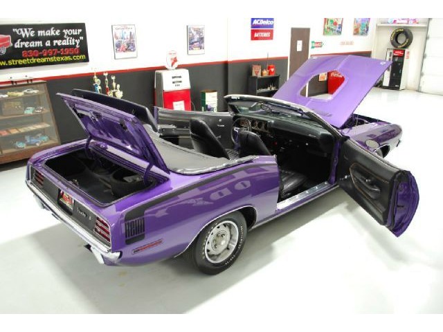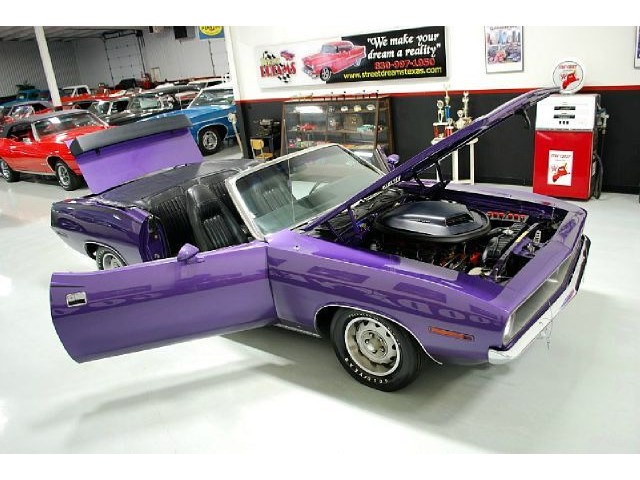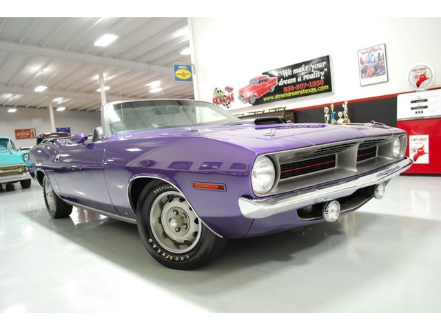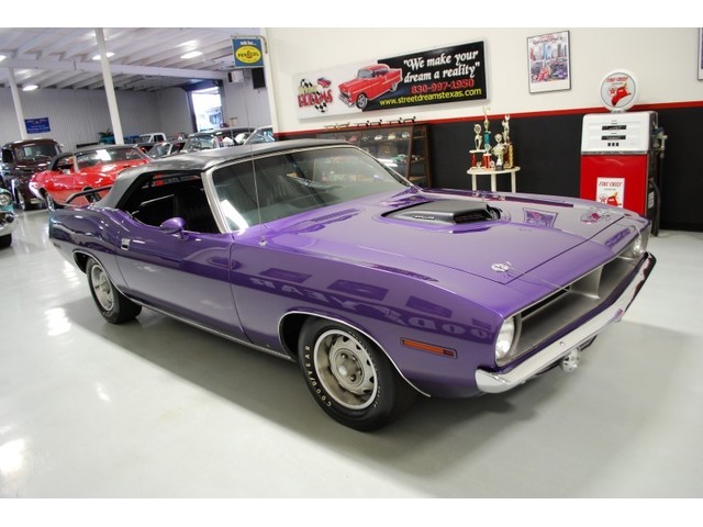 Welcome to streetdreamstexas online auction.  We are celebrating our 15th year in the classic and collector car business.  We strongly feel that investing in a classic car or truck is still one of the safest and most fun places to have your money stored.  You would be Plumb Crazy to pass up the opportunity to ride around in a car some have paid over a million dollars to own over the last several years.  We just saw an original Hemi Cuda convertible bring 3.5 million at Mecum... This Cuda started life as a 383 V-8 big block car but had opportunity to have the period correct Dual Quad Street HEMI installed during the restoration. (why not) The execution was done to a very high standard and the car looks, runs, and dries as authentic as could be. The Shaker hood scoop with the HEMI logo gives it away so you will not surprise anyone at the red light. It has a beautiful body with smooth panels, excellent Violet paint aka Plumb Crazy, terrific chrome, glass, and trim, The fit up is top notch and the car looks correct from every angle. The hockey Stick stripe is subtle but looks so good. Other notable features are a refurbished, smooth shifting 4-speed transmission with new clutch pp & throw-out bearing, correct hood pins, factory style front driving lights, blacked out tail light panel, Go Wing, correct dual exhaust ports, Rally wheels, and period correct reproduction Goodyear Polyglas white letter tires. If you did not know better you would swear it is the rear deal. The immaculate interior features high back bucket seats with leather inserts, console, legendary Pistol Grip shifter, deluxe trim, Rally dash, with tachometer, working AM/FM radio, all covered by a high grain vinyl power top. The refurbished chassis is tight and features power front disc brakes, power steering, and a Sure Grip rear end with 3.55:1 gears. You can argue the value of a clone but this is a very desirable car with the best equipment you could have gotten and it has a real HEMI! Make it yours today and really burn some rubber! Financing, insurance, and delivery are easier that you can imagine.
