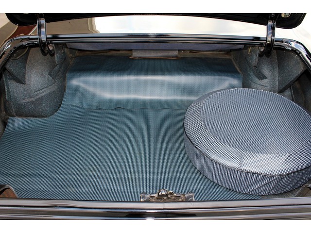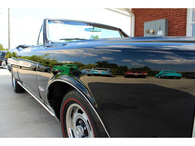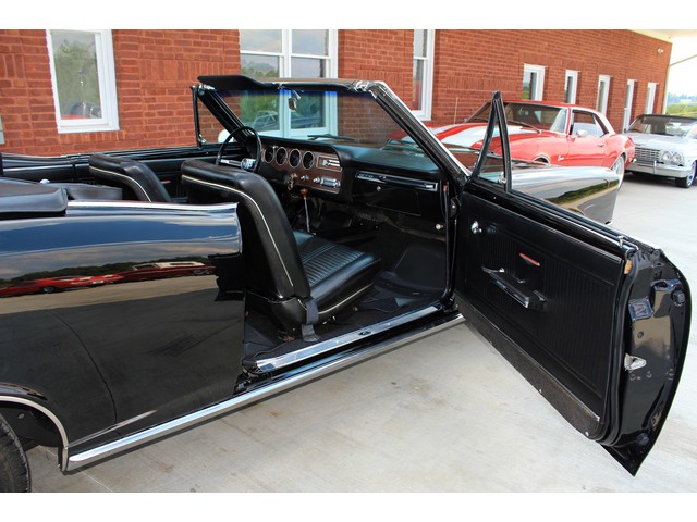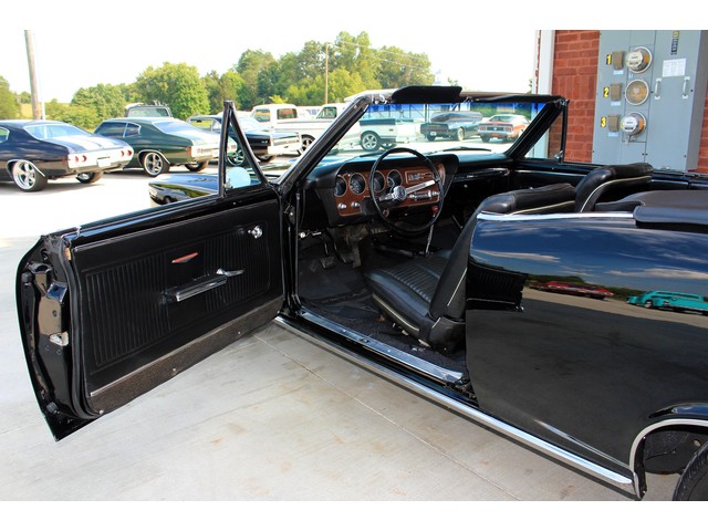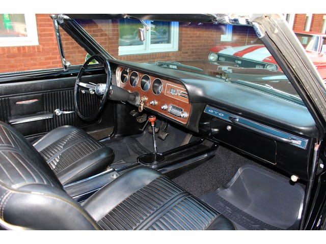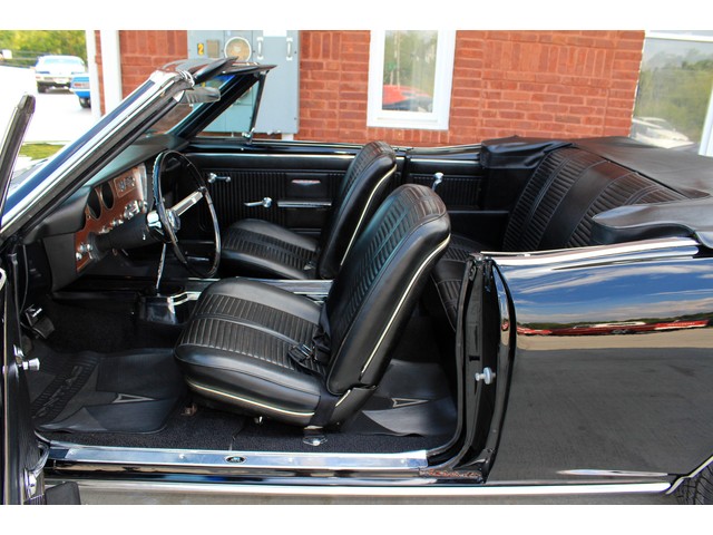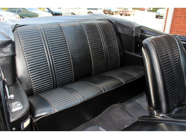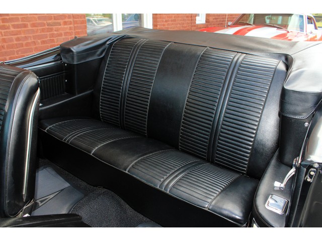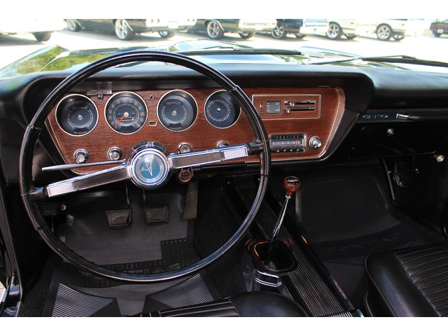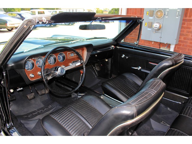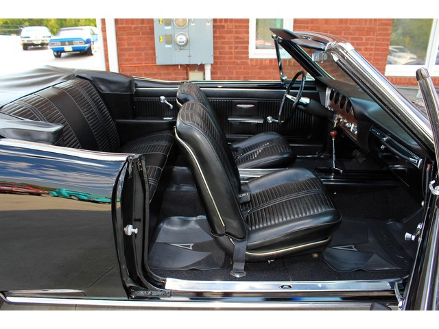 Next, we will take a look at the interior of the Convertible. Everything on the inside is all done in classic black. The seats and door panels look to be factory. It has the bucket seats with the correct console and 4 speed shifter. The carpet looks new and the floor mats appear to be correct as well as the seat belts. The top is power and it has a black boot. The dash has the factory wood grain and it all looks correct.
