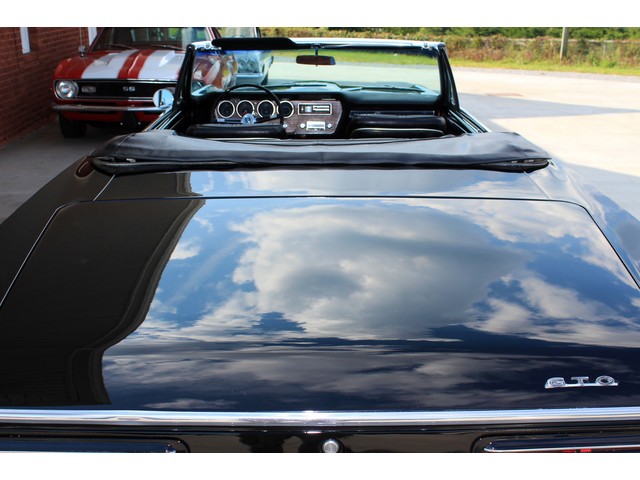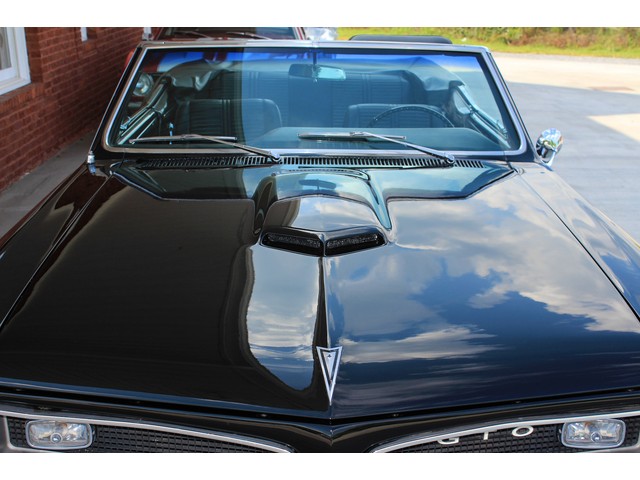 We will start off with the exterior of the GTO. When this car was painted it was stripped to the bare body. It has all the correct sheet metal. The body is arrow straight with the fit of the panels being very good. Everything is covered in the Starlite Black that shows very well with a deep rich shine and is accented by the Black Top. When this car was redone the factory bumpers were took and rechromed so the numbers on the bumpers would be right. The stainless on this Goat looks very good with only the wheel opening molding being replaced. At the time of the repaint they the top and pad was installed new. The final exterior touch is the stock rally wheels and a set of red line tires.