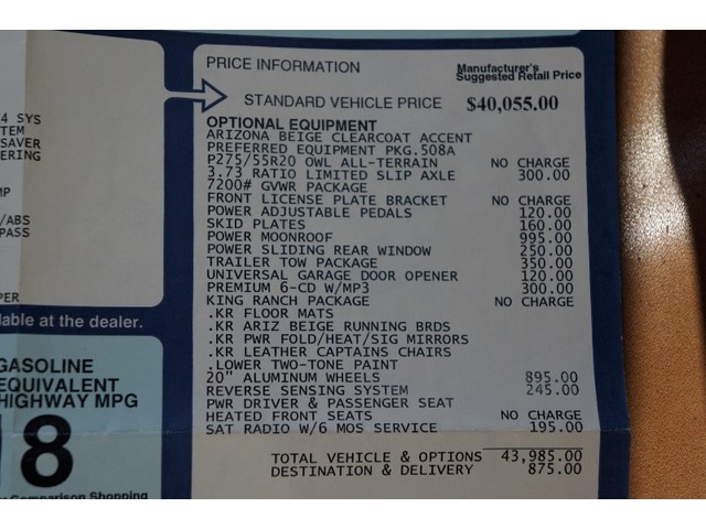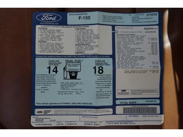 This F150 is equipped with the King Ranch Package, Crew Cab, 4x4, Power Moonroof, Power Sliding Window, Leather Seats, Heated Seats, Power Seats, In Dash CD Changer, Rear Parking Sensors, Power Adjustable Pedals, Power Windows, Homelink System, Running Boards, Bed Liner,  and Rear Hitch. All of the Books and Manuals are available for this  F150.  The previous owner really maintained this truck well.  As you can see in the photos, there is quite a few receipts of the regular oil changes and maintenance.    As far as maintenance, we did a computer diagnostic and everything checked out great, there was no codes for the engine or transmission. There is no check engine light nor any other kind of lights on. It is absolutely ready condition and mechanical wise for its new proud owner.   Overall, this F150 has been well kept up maintenance and condition wise.
