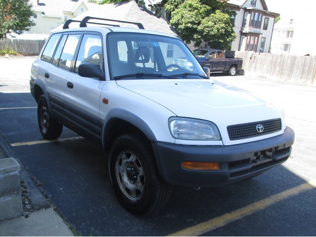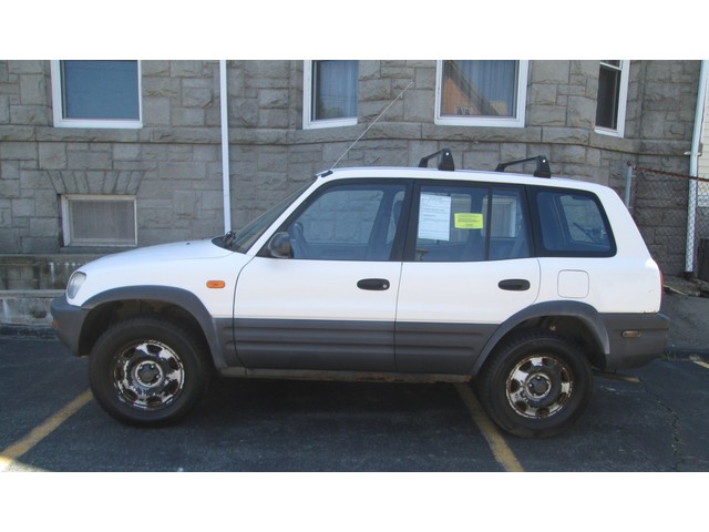 A two-tone 1997 Toyota RAV4 with a five speed manual transmission, four doors, gray cloth, Roof rack, Pioneer CD player, airbags.