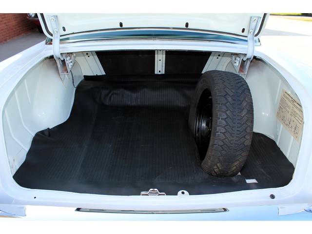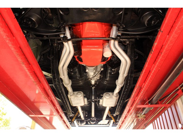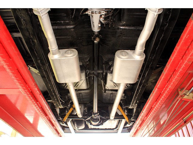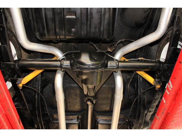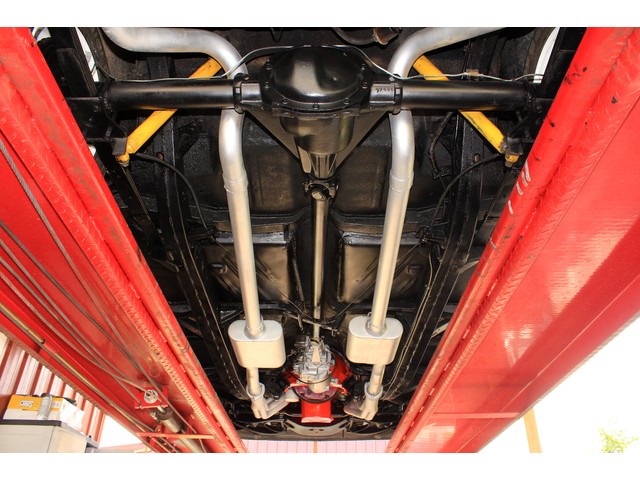 Under the hood it’s powered by a small block V8 that’s mated to a Muncie 4 Speed trans and a late model 10 Bolt Rear End. The engine is dressed with vintage aluminum fined valve covers and breather. It has an aluminum intake and a Holley carb. The exhaust flows through headers and a set of Flow Masters. It has electronic Ignition and the charging system was changed to an Alternator. When you look at the bottom of the ’57 everything appears solid.