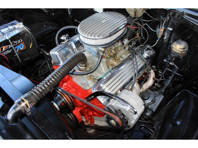We will start off with the exterior of the Black Widow. It’s laser straight with good lines and great fit of the panels. Everything is covered in the Black and White Two Tone scheme. The paint has a deep rich shine that shows very well. It has a new windshield and side glass with new seals. All the weather stripping is new as well. When you look at the stainless it looks very good with some appearing new. The bumpers are new as well as other chrome. The final touch is the steel 8”s that are painted white with the small hub caps and BFG tires.