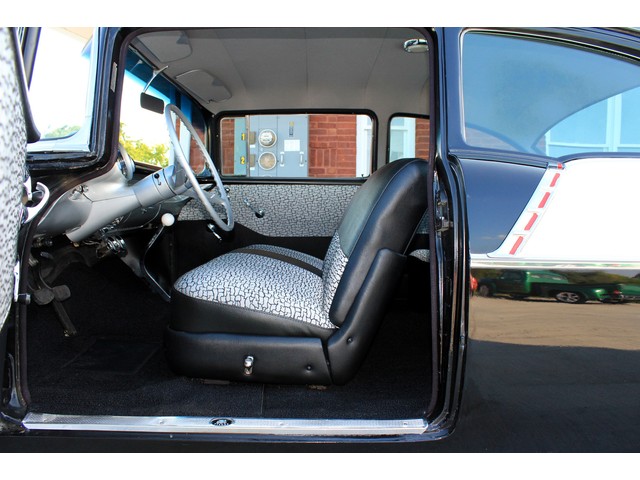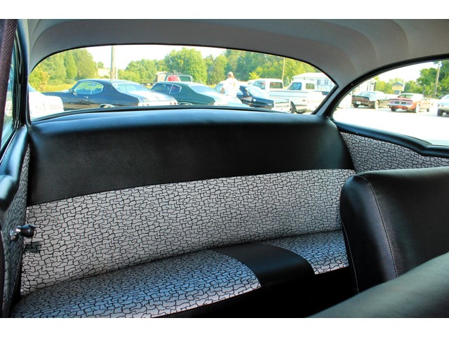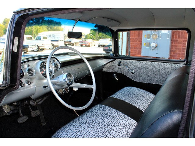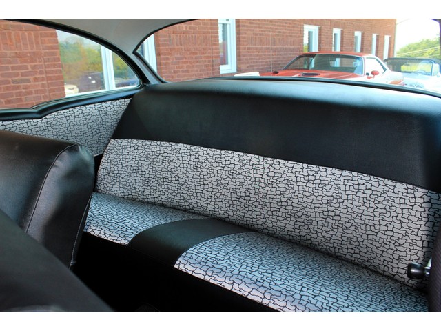 Next we will take a look at the interior of the ’57. Everything on the inside appears to be correct form what we have seen. It’s done with the 150 covers and door panels that are done in black with gray and black inserts. When you look at the dash it’s done in the correct black and gray as it would have been. This is a radio delete with only a set of aftermarket gagues under the dash. The 4 Speed shifter looks correct for a bench seat with the white knob.