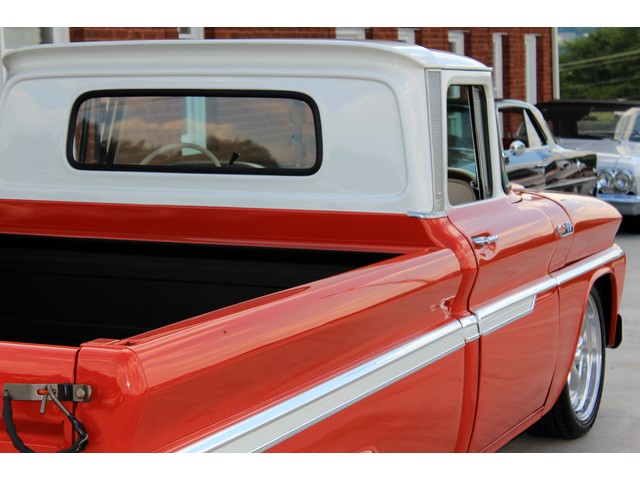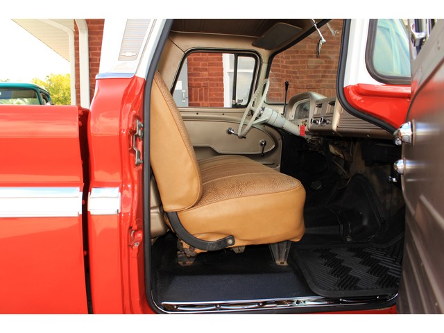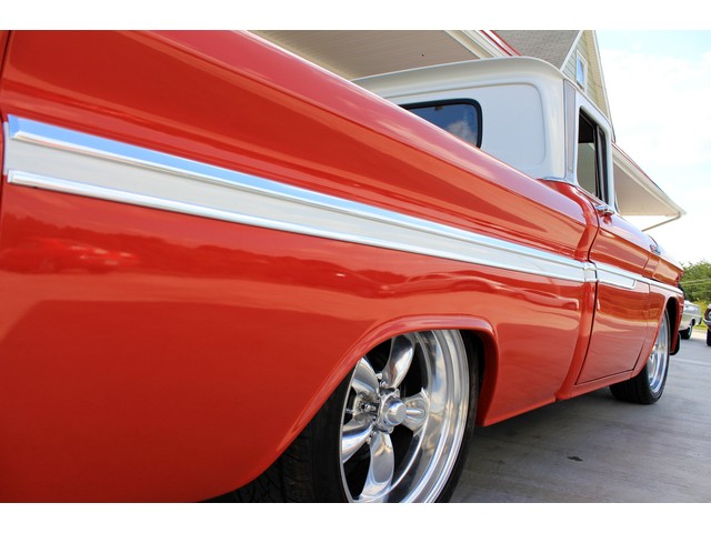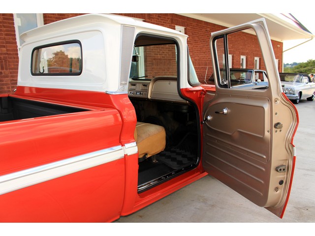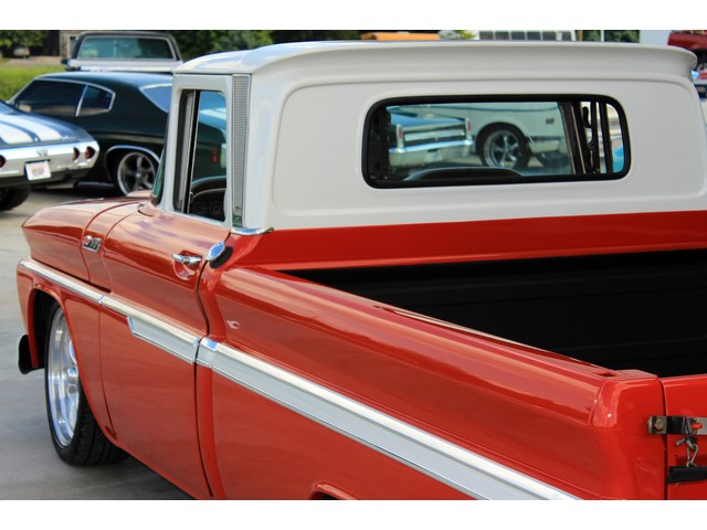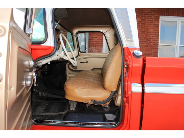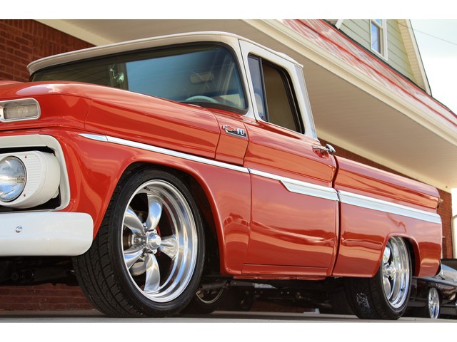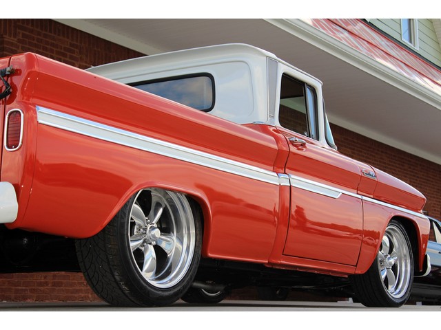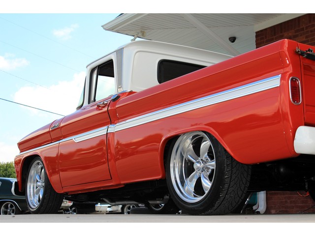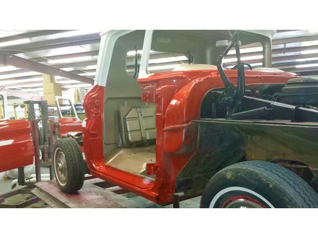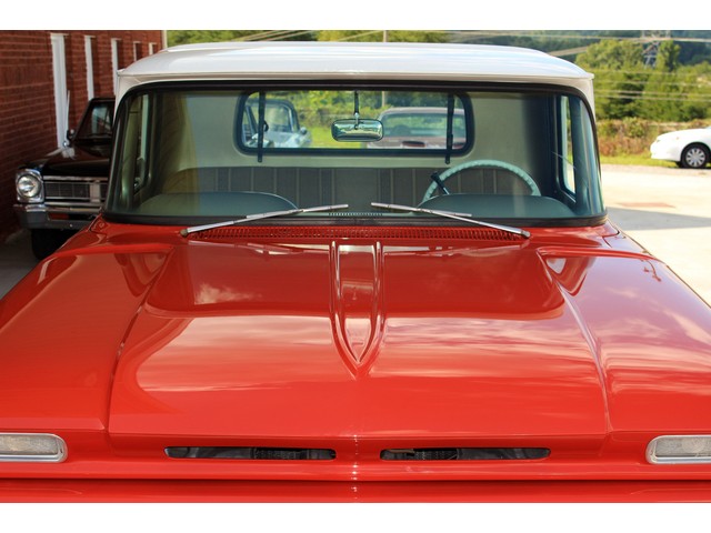 We will start off with the exterior of the Pick Up. As we said this is a fresh resto that was pulled apart and redone. Everything is covered in the Cardinal Red Paint that is accented by the Pure White Top and inlay in the chrome. All the glass was pulled out and what was bad was replaced with new seals and trim installed. The bed was striped and they left the steel floor that was added before the resto. The stainless looks very good. The grill and bumpers have been painted to give it some more accent. The final exterior touch is the new 20” American Racing Wheels on the Corners.