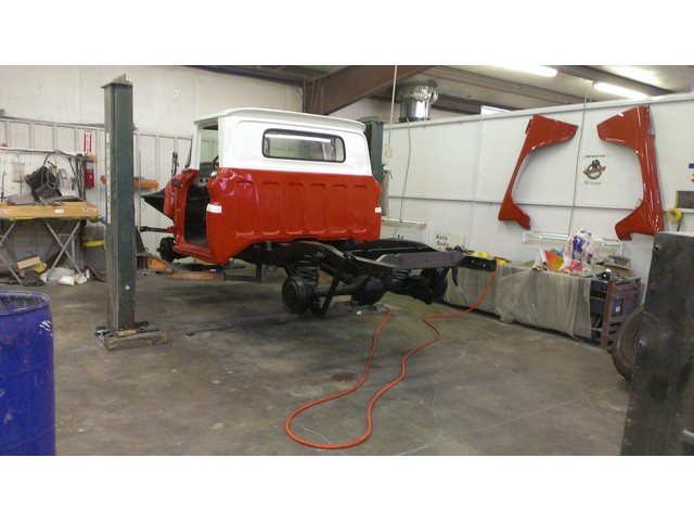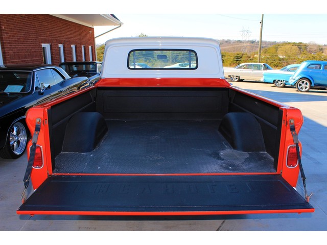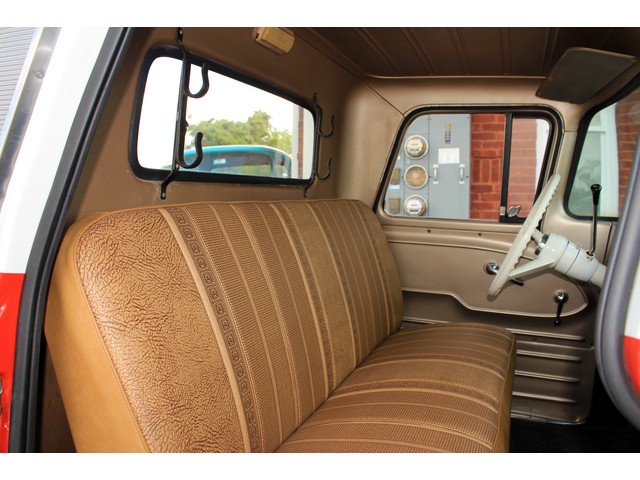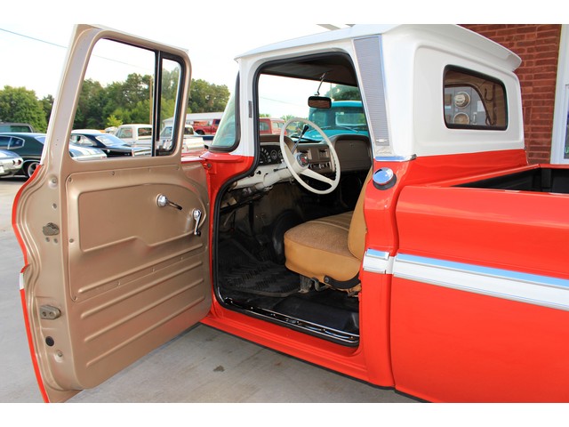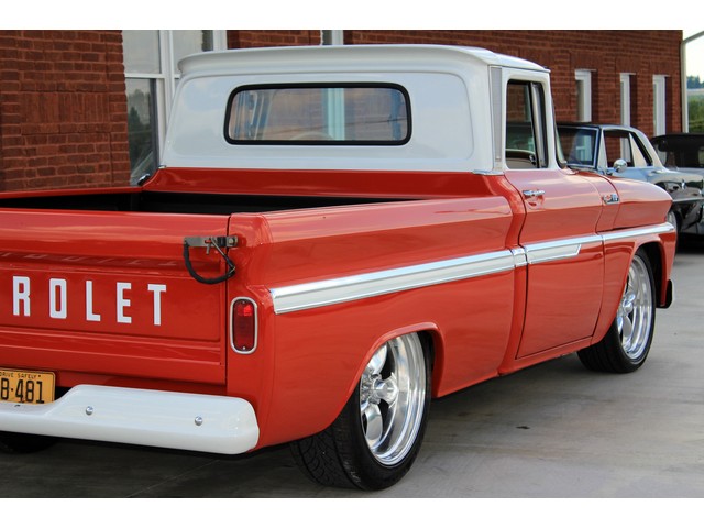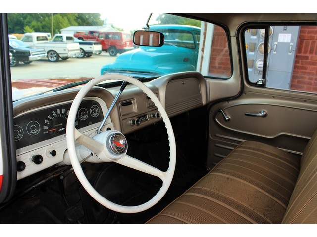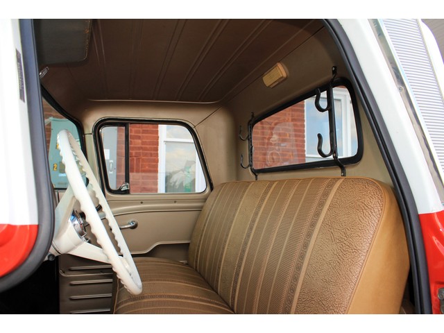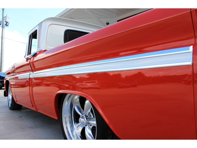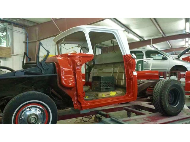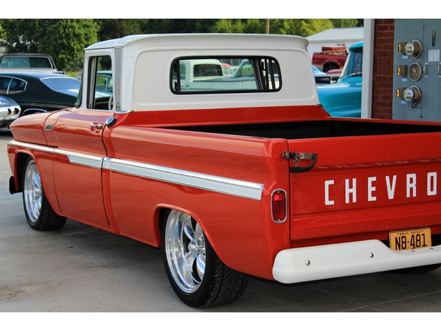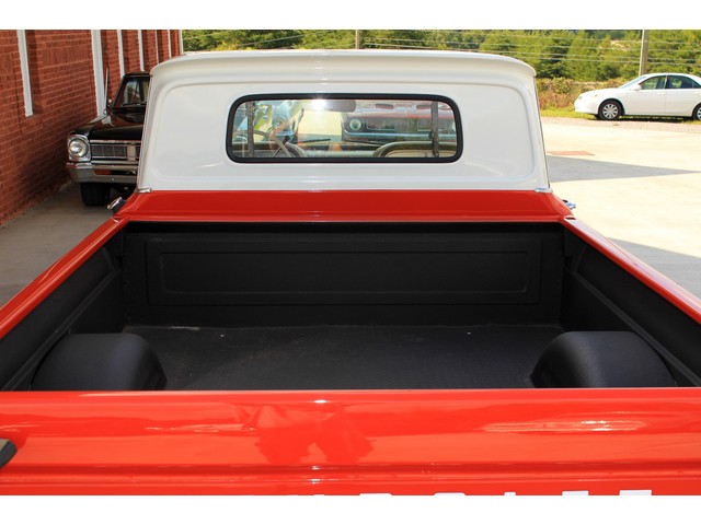 We will start off with the exterior of the Pick Up. As we said this is a fresh resto that was pulled apart and redone. Everything is covered in the Cardinal Red Paint that is accented by the Pure White Top and inlay in the chrome. All the glass was pulled out and what was bad was replaced with new seals and trim installed. The bed was striped and they left the steel floor that was added before the resto. The stainless looks very good. The grill and bumpers have been painted to give it some more accent. The final exterior touch is the new 20” American Racing Wheels on the Corners.