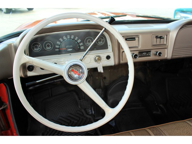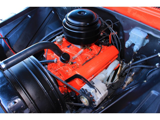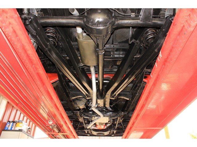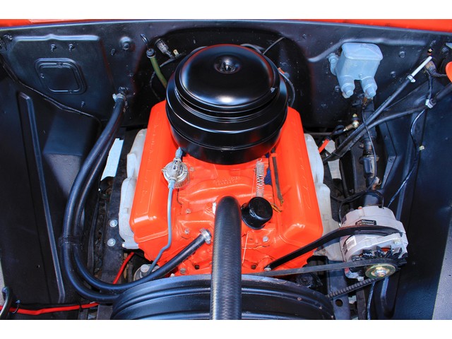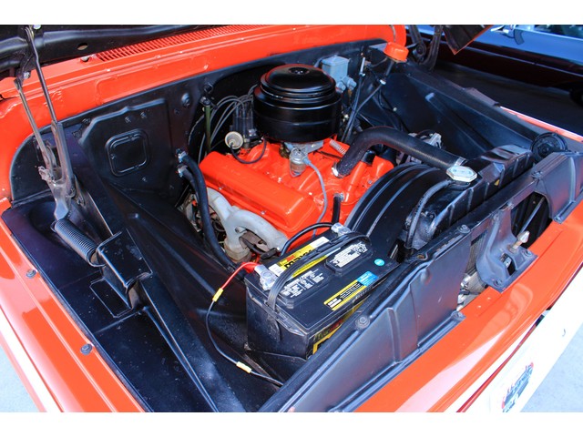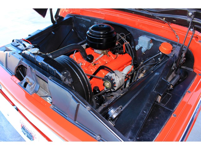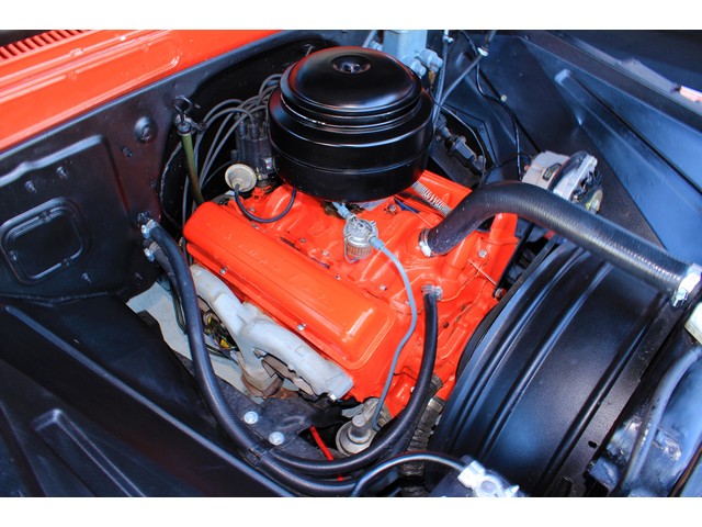 Finally, we will take a look at the heartbeat of the Chevy. Under the hood it’s stock with the numbers matching 283 V8 that is mated to a 700R4 Trans. It retains the stock 2 Barrel Carb and breather. The brakes have been upgrade with disc up front and it does have Power Steering. It retains the stock rear end as well as the Torsion bar Front End. They kept the exhaust simple with stock manifolds and single exhaust. The frame and floors of the cab all appear solid.