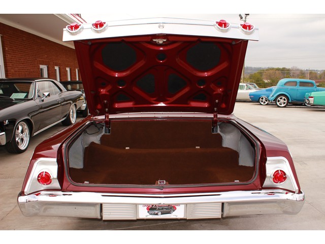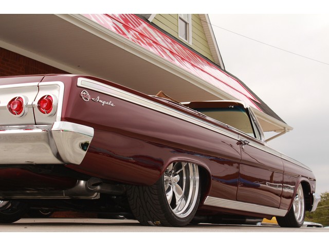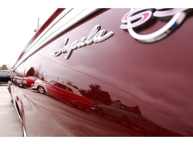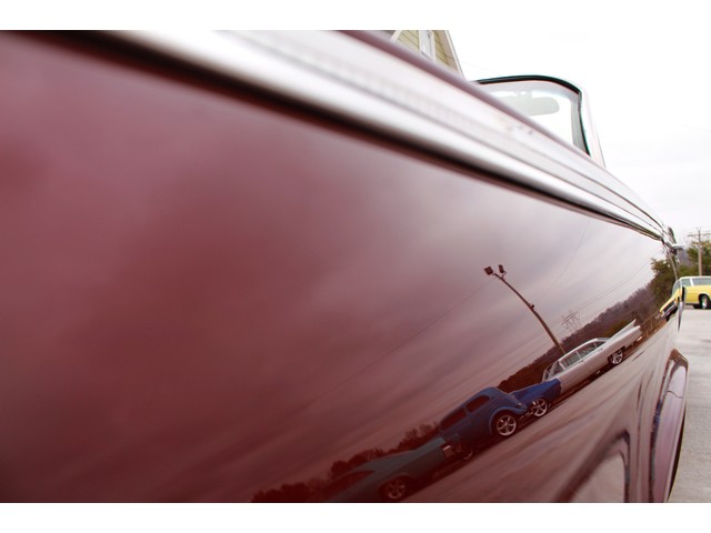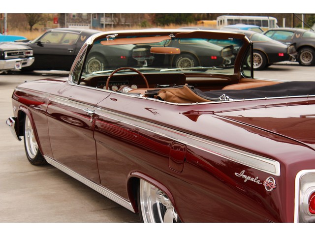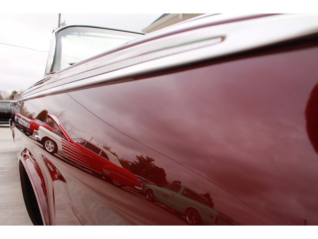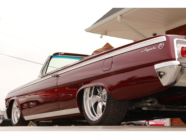 We will start off with the exterior of the Impala. When you look down the sides you will see it’s laser straight. It’s easy to see this was a frame off build. The body was set off the frame and pulled apart. All the body work was done and then everything was reinstalled to ensure a good fit before being taken back apart for paint. Everything is covered in the Maroon Pearl Paint that has been buffed and polished to a deep rich shine and is accented by the new convertible top that is done in Carmel and new back glass. It has had new stainless installed and what appears to be new glass. All the weather stripping was replaced as well as the window felt and seals. Also it has new one piece Bumpers and other new chrome. The final exterior touch is the set of 18” and 20” American Racing Wheels and New Tires.