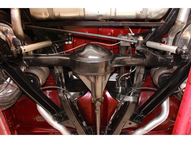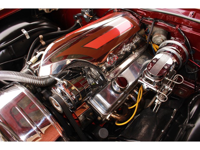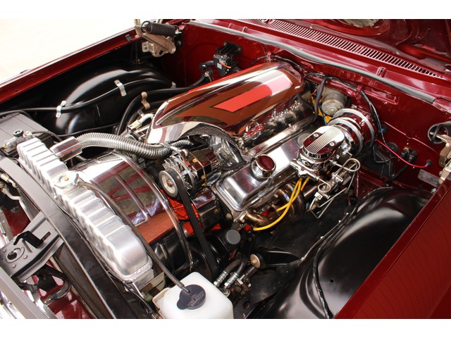 Finally we will take a look at the heartbeat of the Chevy. Under the hood it has a small block V8 that is mated to a 700R Trans. The engine has been dressed to the max with a Polished Intake and Valve Covers with a custom breather. And for the Chrome it has the AC Compressor, Alternator, Booster and Master Cylinder. Also, it has coated headers with flow master exhaust. To keep it cool it has an Aluminum Radiator. The fire wall has been painted to match the exterior of the car and the inner fenders are done in black. The brakes are Front Disc with Drilled and Slotted Tors. Also it has Power Steering. As we said earlier this is a frame off resto with the floor pans painted to match the car and the frame being done in black. Also it has ride tech Air Ride System for the front and back, and all the fuel lines and brake lines were replaced.
