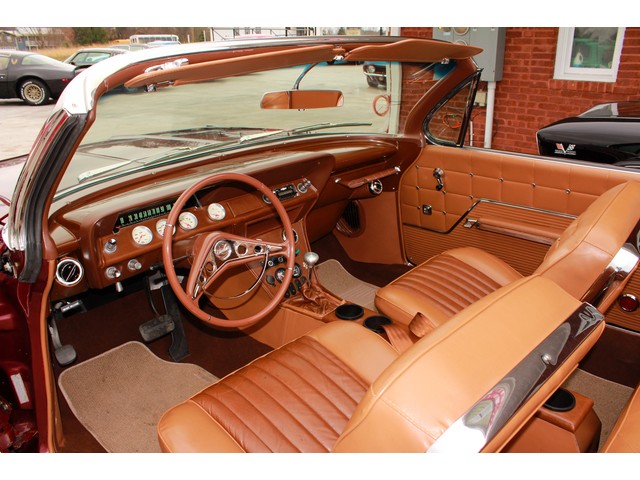 Next, we will take a look at the interior of the ’62. The interior is every bit as nice as the exterior and provides the perfect complement to the exterior scheme being done in Carmel and Brown make for a killer look inside and out. It has bucket seats that are correct for the car and a custom console that has a Lokar Shifter with the Air Ride Controls and Vintage AC controls in it. The dash and carpet is done in a dark brown the seats and door panels being Carmel and brown. It has power Windows that work as they should. The radio has been upgraded to a Vintage AM/FM and this ride also has seat belts.
