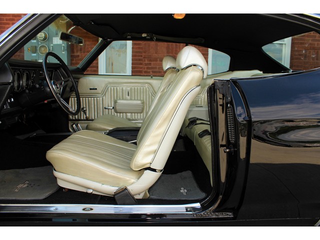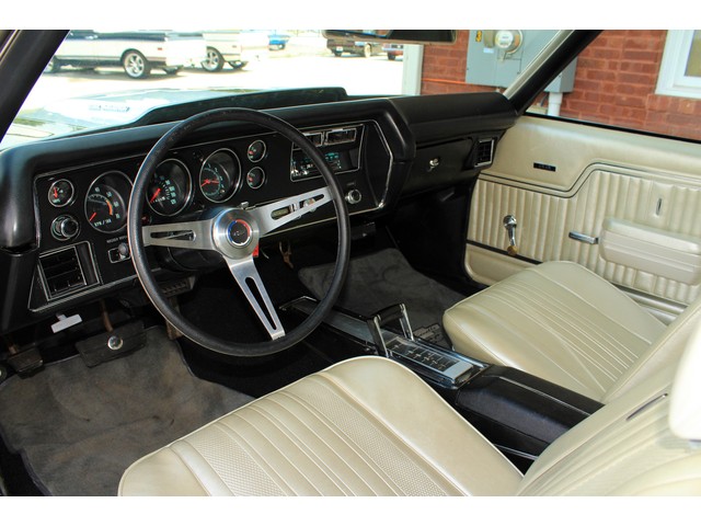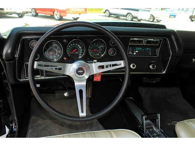 Next, we will take a look at the interior of the ’70. Everything on the inside of this Chevelle looks all new. It has the correct bucket seats and console. The seats and door panels are done in peral which was only offered in the ’70 model. The dash and carpet it done in black and as you can see it has the round cluster that sports the factory tach with everything working. The radio has been upgraded and it also has a tilt column.