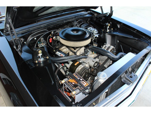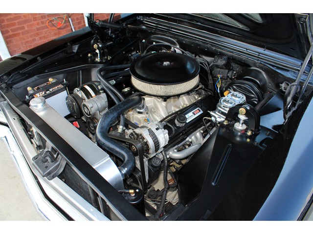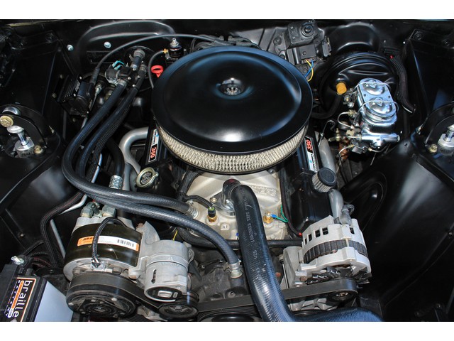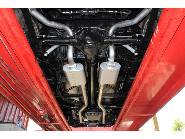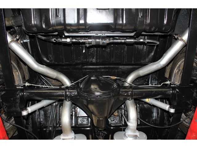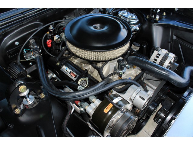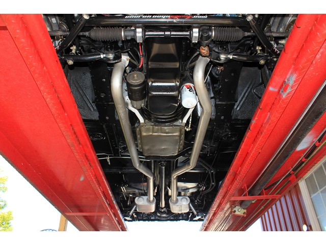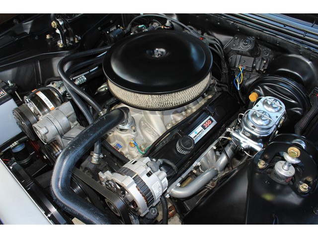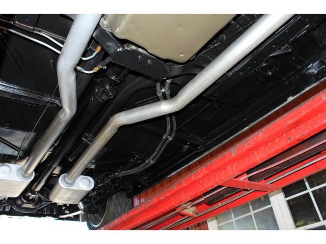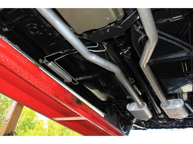 Finally, we will take a look at the heartbeat of the Chevy. Under the hood it looks every bit as nice of the rest of the car. The engine is a 350 Crate Engine from GM that has the FastFuel Fuel Injection System with MSD Ignition. It has the GM Pulley for Serpentine Belt. The radiator was changed to Aluminum to keep it cool. The Trans is a 700R Overdrive Hooked to a 10 Bolt Rear End. The steering was changed to a Rack and Pinion that is Power and the brakes were upgraded to 4 Wheel Disc with Drilled and Slotted Rotors that are also Power. Under the front end it has an all Tubular Front End with Coil Over shocks. They added the Big Sway Bar to help with the handling and floors are super solid.