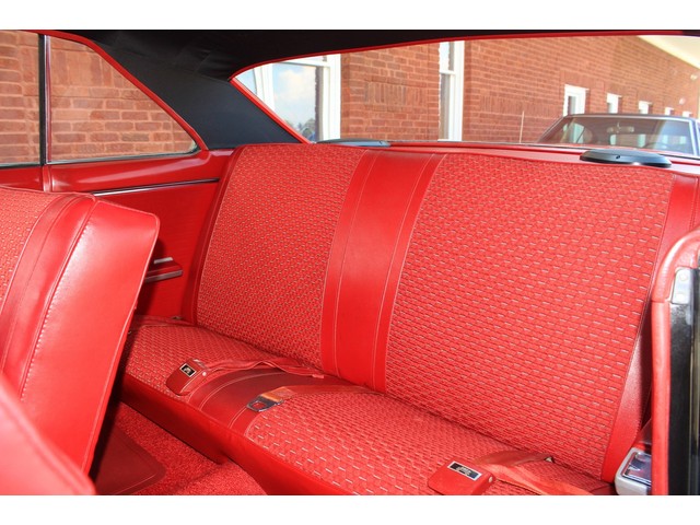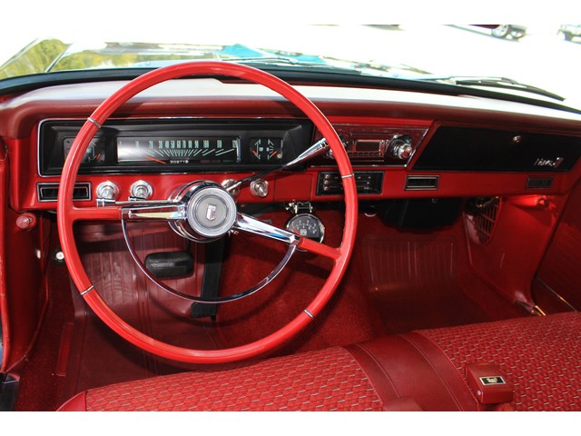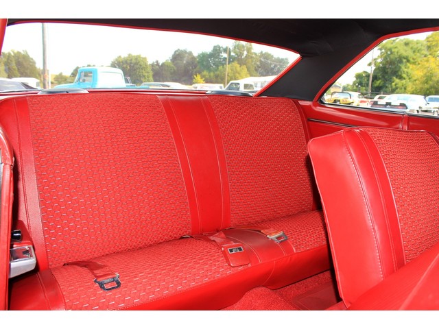 Next, we will take a look at the interior of the ’66. On the inside it’s done in the factory Dark Red that provides a killer look paired with the Black. It has a bench seat with what looks like factory covers. It has red carpet and a black headliner. When you look at the dash it has the gauge cluster dash with an under dash tach. It has an aftermarket radio and they added the AC vents to the bottom of the dash. Also it has an Ididit Tilt Column with stock wheel. This Nova even has the stock seat belts.