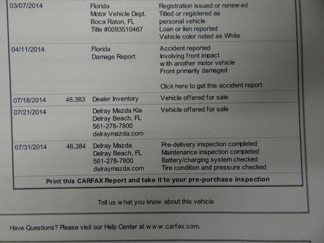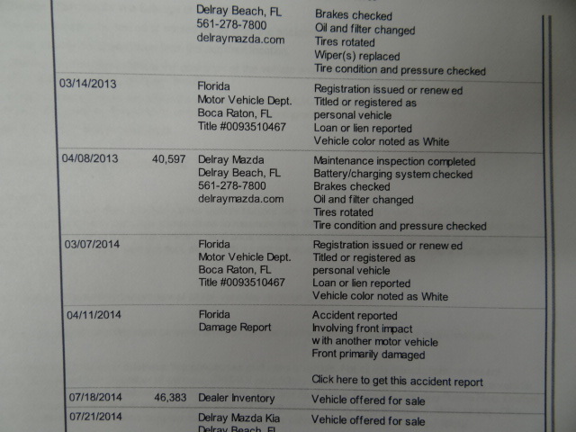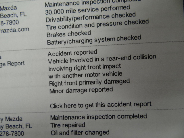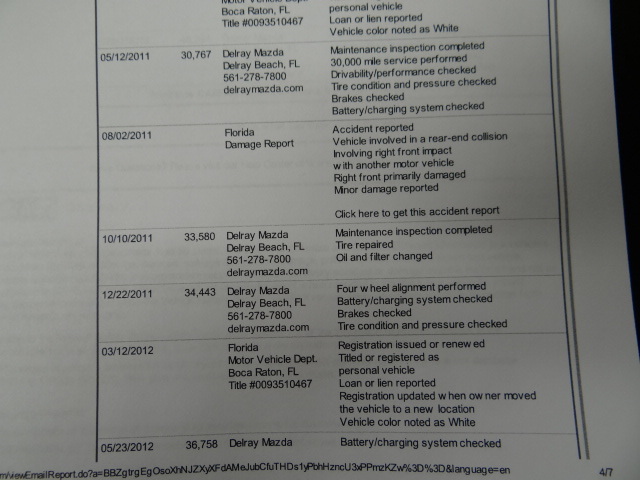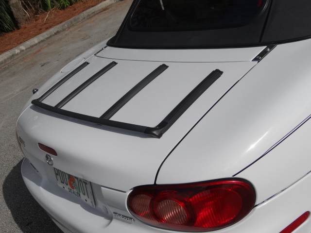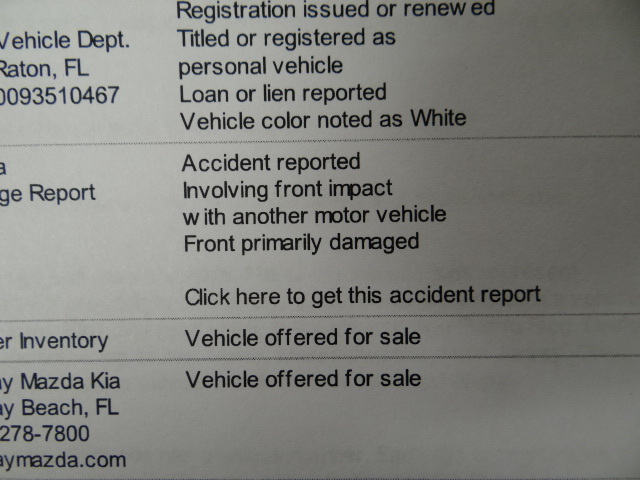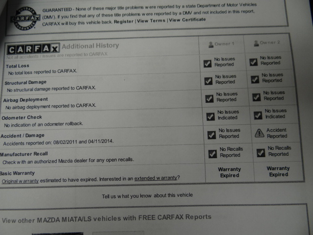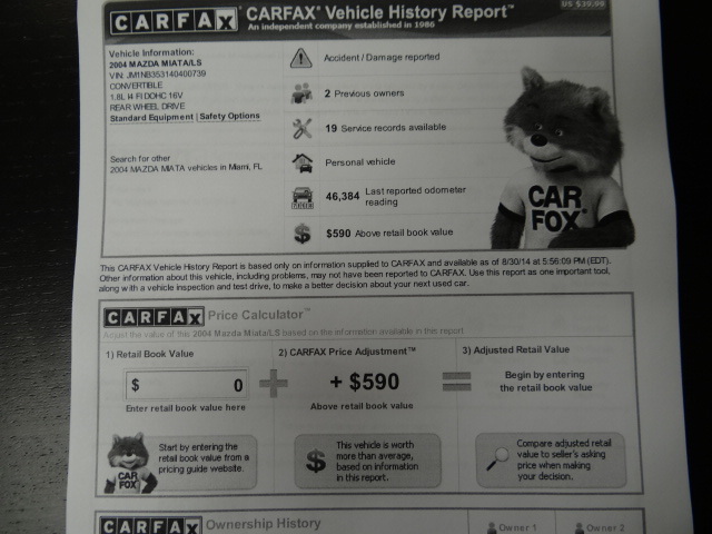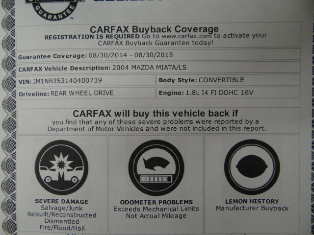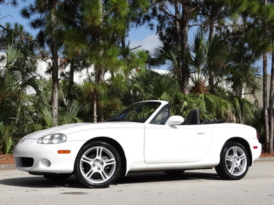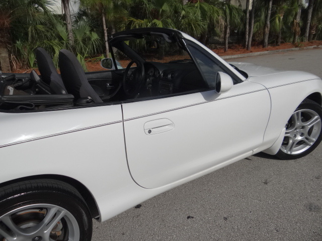 YOU ARE VIEWING A SUPER NICE 2004 MAZDA MIATA 5 SPEED! WOW! ONLY 46K ACTUAL MILES! NO RESERVE AUCTION! CARFAX CERTIFIED BUY BACK GUARANTEE! SHOWS TWO MINOR INCIDENTS ON THE CARFAX ONE CAUSED A SMALL NICK IN THE FRONT BUMPER AND THE OTHER SHOWS NO DAMAGE. WELL DEALER SERVICED WITH RECORDS! VEHICLE HAS NO SIGNS OF PRIOR COLLISION DAMGE! NO FRAME DAMAGE! OPEN TO INSPECTIONS! LOADED UP WITH PREMIUM AUDIO, PREMIUM ALLOY WHEELS, PROJECTOR HEADLAMPS, CRUISE CONTROL, FOG LAMPS, POWER WINDOWS, POWER LOCKS, KEYLESS ENTRY, TEMPERATURE GAUGE, COMPASS AND MUCH MUCH MORE! THE COLOR IS RIGHT ON THIS ONE! WHITE IS PRETTY HARD TO FIND AND LOOKS AWESOME WITH THE BLACK INTERIOR! DRIVES LIKE NEW! BODY IS IN EXCELLENT CONDITION! INTERIOR SHOWS REAL WELL! NO RIPS OR TEARS! DONT MISS OUT ON THIS DEAL! 7 DAYS NO RESERVE AND THE HIGHEST BIDDER WILL OWN THIS BEAUTY! ABSOLUTE SALE! IF YOU HAVE ANY QUESTIONS PLEASE CONTACT US AT 305-345-8318 OR 305-200-9433. FOR GREAT SHIPPING RATES CALL OR EMAIL ZIP CODE! |