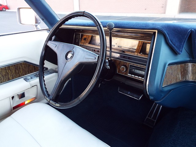*** BEAUTIFUL - CODE "353" - WHITE AND BLUE WITH FAUX WOOD GRAIN ACCENTED LUXURY DEVILLE INTERIOR AND A BEAUTIFUL - CODE "J" - MATCHING WHITE FULL VINYL TOP !! ***