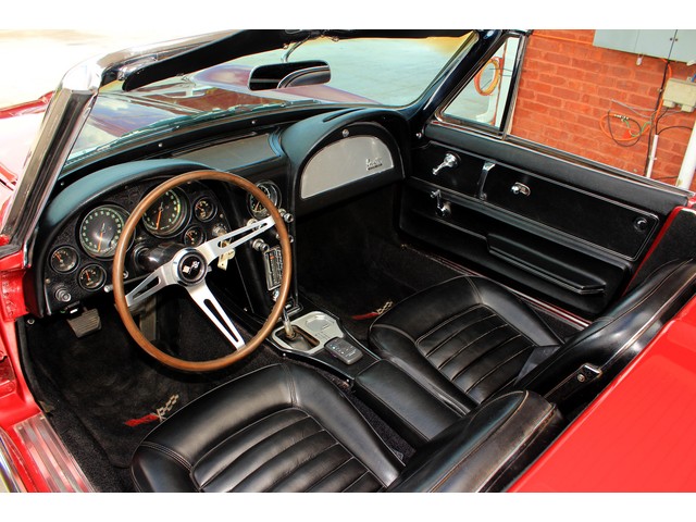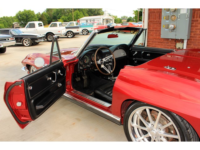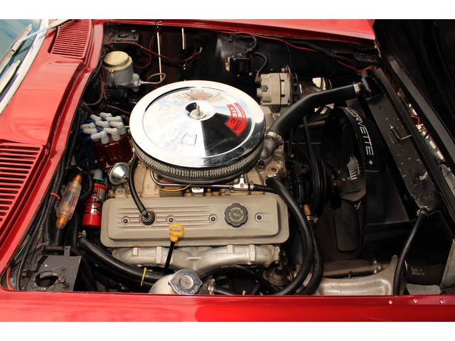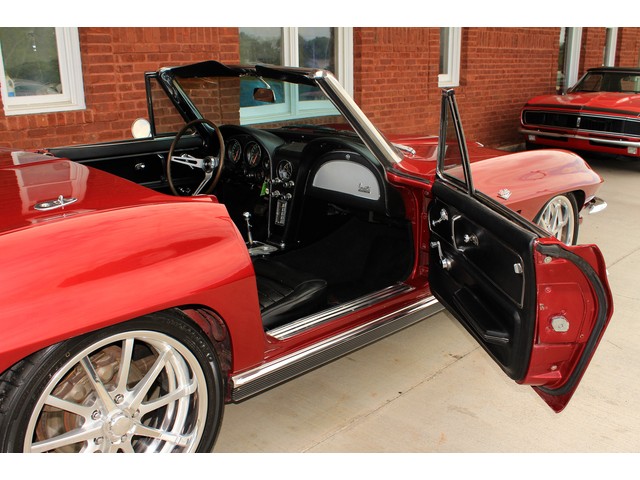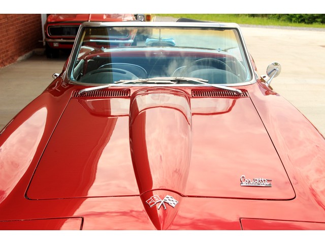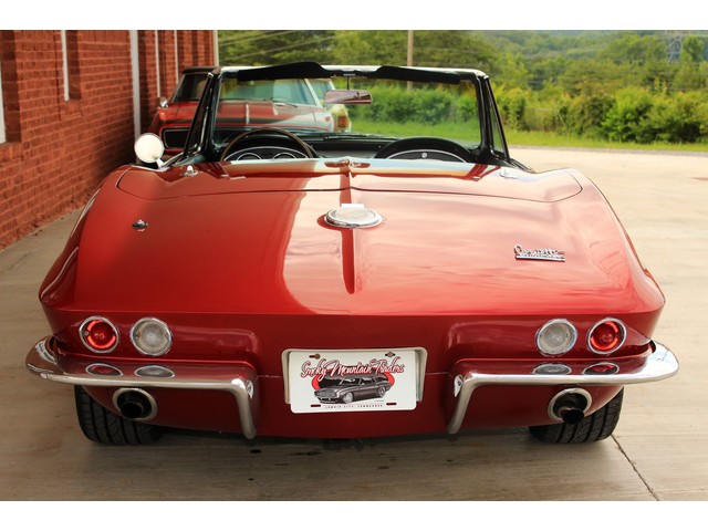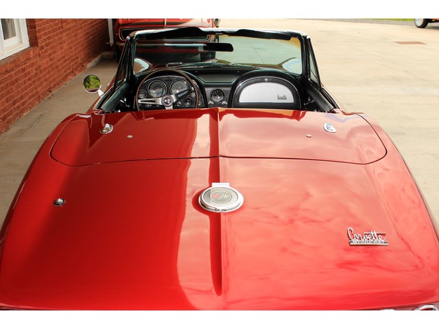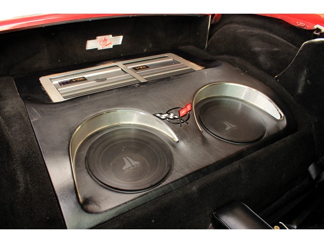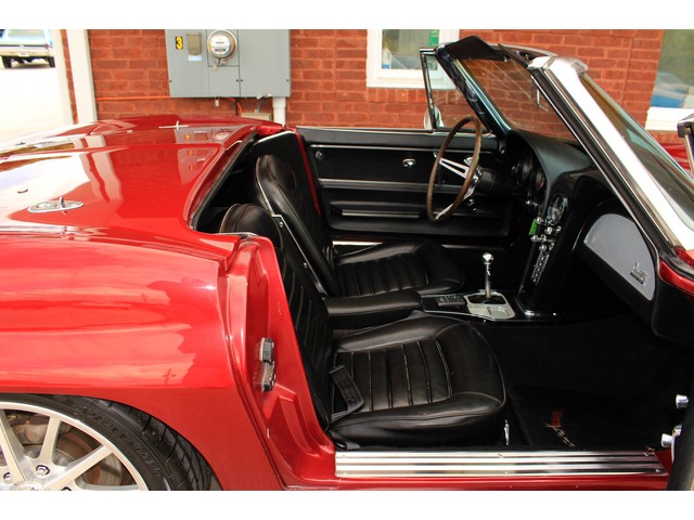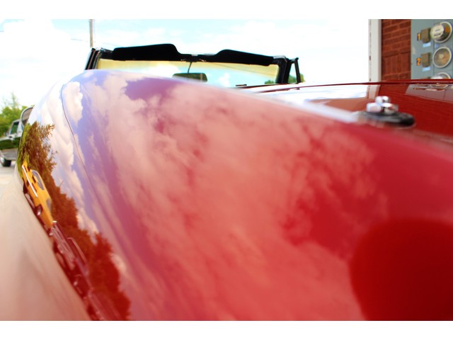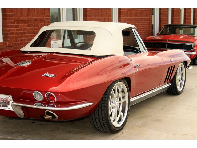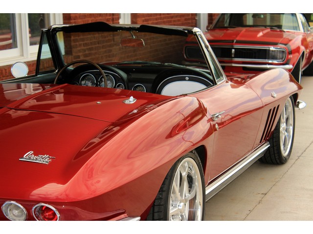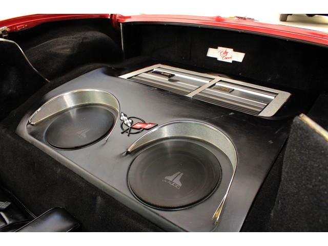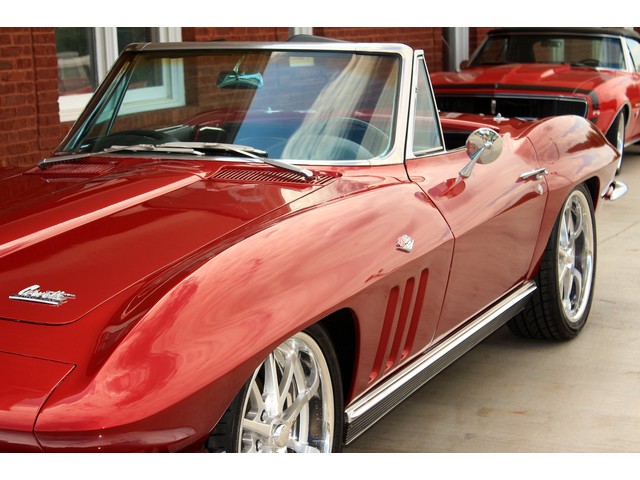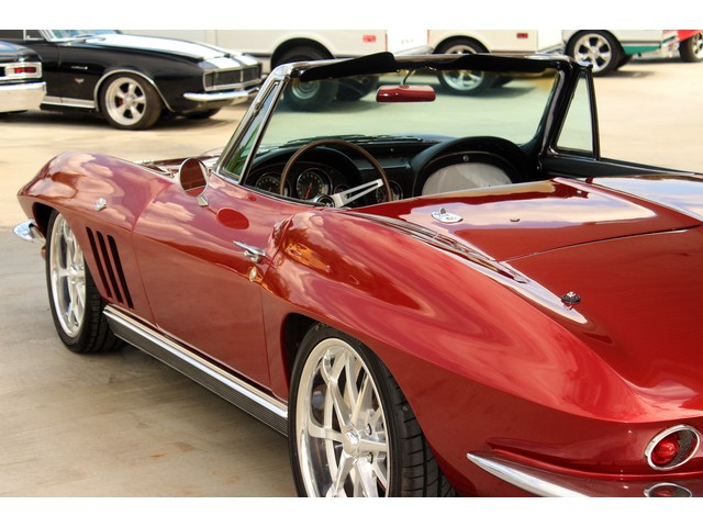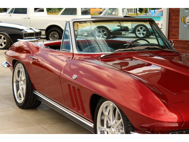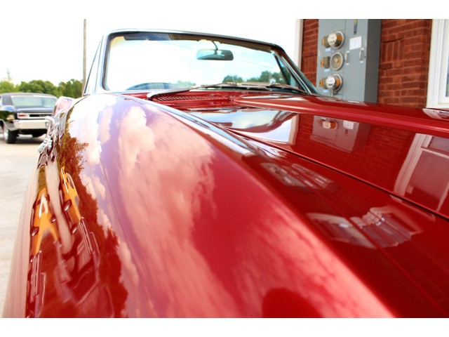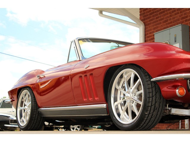 We will start off with the exterior of the Corvette. The body is solid with no spider webbing. The door and hood open as they should. Everything is covered in the Honduras Maroon Pain that has a deep rich shine that shows no signs of lifting or cracking and is accented by the White Convertible. The stainless looks to be the factory trim that shows very well. All the weather stripping was replaced at the time of the resto. The final exterior touch is the set of custom built Billet Specialty Wheels on the Corners