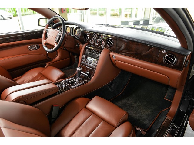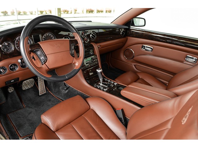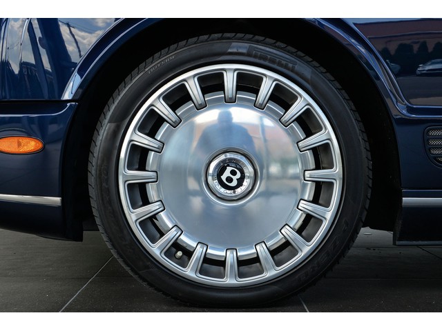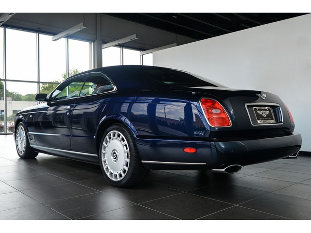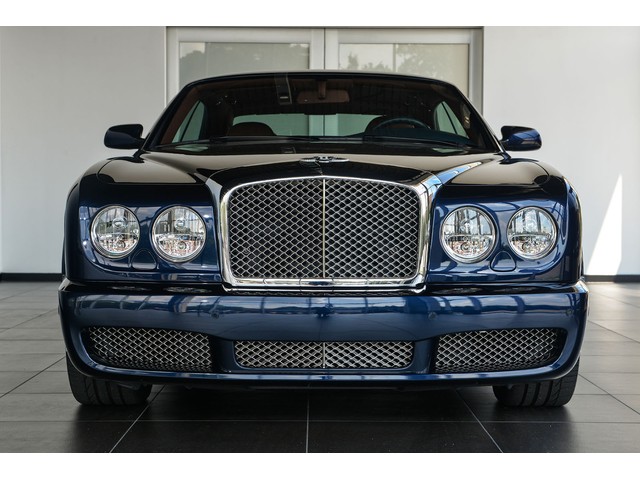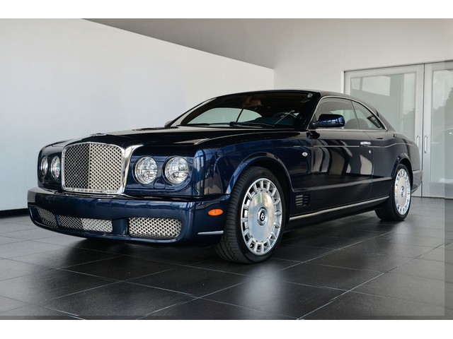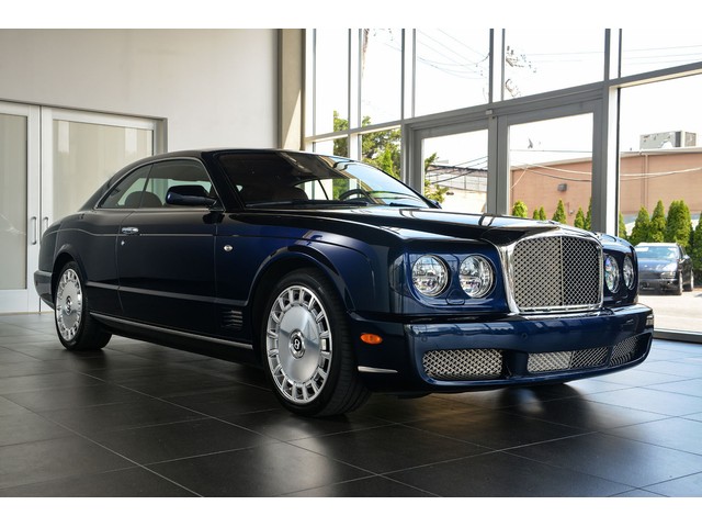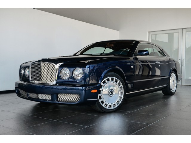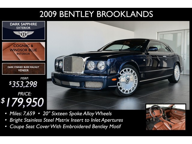 2009 Bentley Brooklands in Dark Sapphire with Cognac hide interior, Windsor Blue secondary hide and Dark Stained Burr Walnut Veneer. Additional features include Bright Stainless Steel Matrix Insert to Inlet Apertures, Radiator Shell - Chrome With Bright Stainless Steel Matrix Style Grille, Coupe Seat Cover With Embroidered Bentley Motif, 20" Sixteen Spoke Alloy Wheels. Original MSRP $353,298