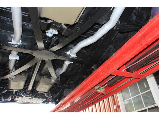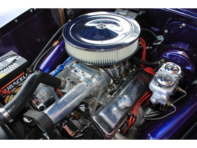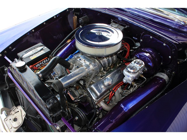 Finally, we will take a look at the heartbeat of the Chevy. Under the hood it’s powered by a 406 V8 small block chevy engine that’s had many upgrades. They added a B&M mini flower with a Holley Carb. It has an electric cooling fan to keep it cool. Also it has short headers with flows. They installed Aluminum Valve Covers along with a polished alternator and a chrome water pump. The trans is a 700R that’s mated to a 9” Ford rear End with 331 gears. Under the front it was changed to a mustang II style with Rack and Pinion Power Steering and disc Brakes that are also Power. The bottom of this ’53 looks good with solid floors and a good frame.