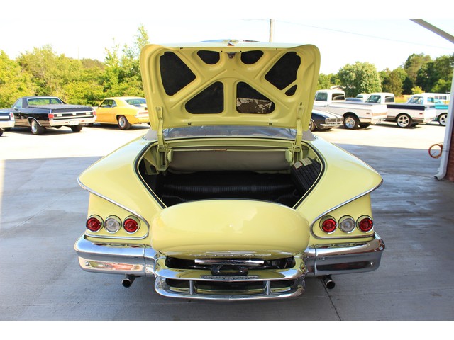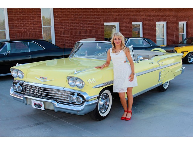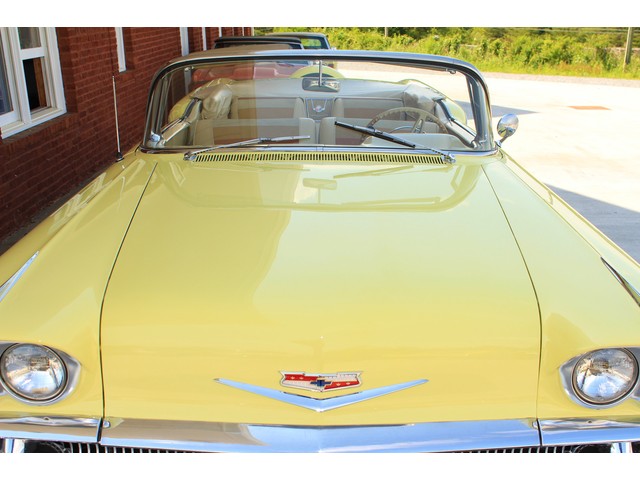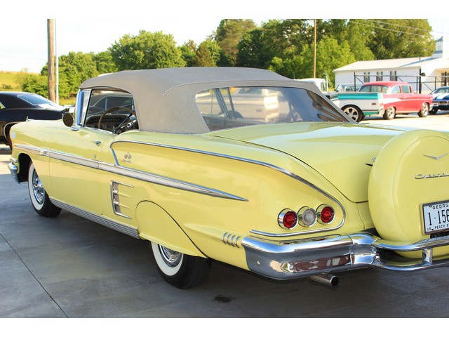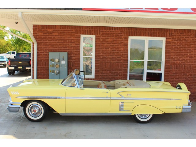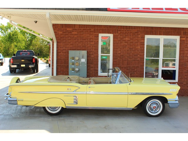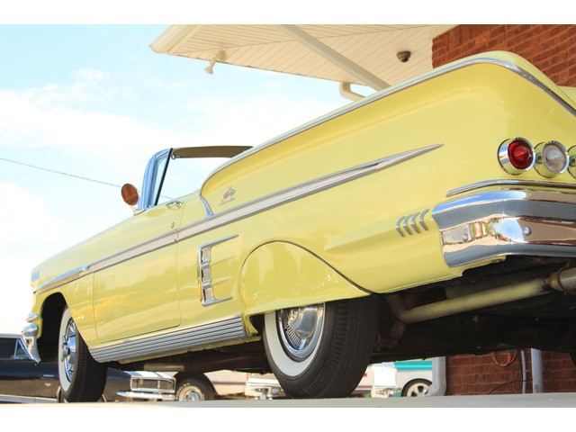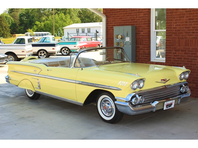 Up for sale we have a 1958 Chevy Impala Convertible. The ’58 was the first year for the Impala. This was a one year body style with a one of a kind look. It was the first year for the dual headlights and the 3 Tail lights on each side. The one we have for you is powered by a 348 V8 with and Automatic Trans. It has spent most of its life in the state of GA as far as we can tell has only had 1 repaint. In the paragraphs to follow we will give a brief description of the exterior, interior, and heartbeat of the Chevy, but first we would like to tell you a little about us.
