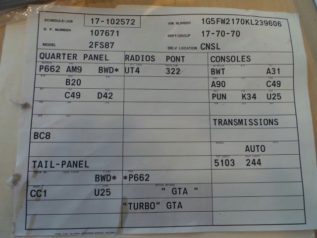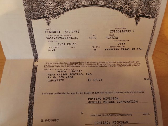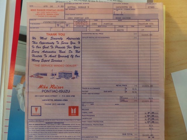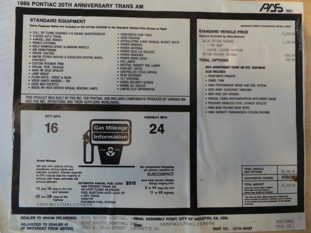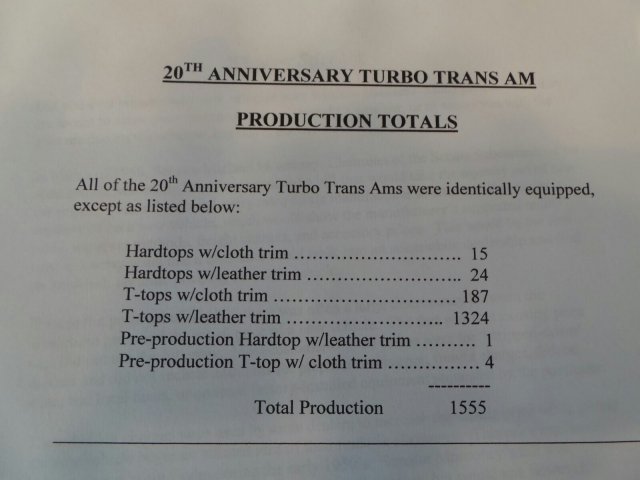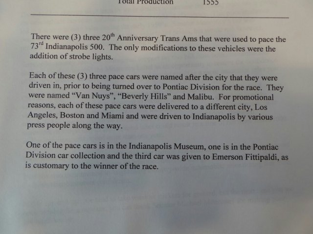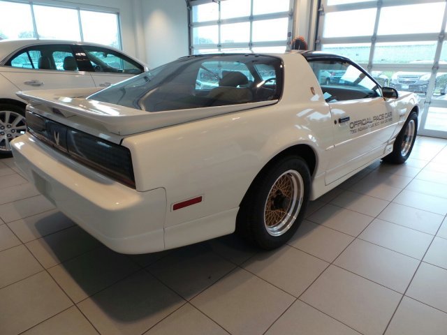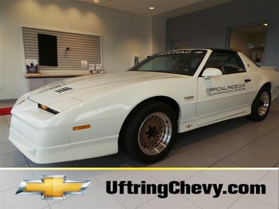 In 1989, to commemorate the 20th Anniversary of the Trans-Am, a total of 1,555 special 20th Anniversary Trans-Am s were produced. These vehicles came from the factory with a unique drivetrain, consisting of a special 3.8 liter, intercooled, turbocharged engine backed by a heavy duty 4-speed transmission. This engine is much the same as the turbo V-6 powerplant shared from the 1986-87 Buick Grand National, however different heads were implemented for improved exhaust flow and combustion chamber design. Subsequently, different pistons were required, a cross-drilled crank was utilized and a larger 12 fin/inch Buick GNX-style intercooler was adopted along with specially designed stainless steel headers and a high-pressure fuel pressure regulator. Although Pontiac officially rated the horsepower at 250hp, in reality it developed an honest 301hp on the GM dyno. The Turbo TA also came with substantially upgraded brakes. The front discs are 12 inch police rotors with Corvette twin piston aluminum calipers. The rear discs were also increased to 12 inches in 1989 and use Corvette single piston calipers. Car and Driver magazine tested the car and it scorched the drag strip with a 0-60 mph blast of 4.6 seconds and a quarter-mile time of 13.4 seconds at 101 mph and a top speed of 153 mph! The 20th Anniversary Trans-Am was selected to pace the Indianapolis 500 and it marked the first time a production car would not need any performance modifications to pace the field. Original Turbo TA owners were sent a special box containing the door stickers, a Turbo TA keychain, cassette tape, and a leather owner s manual cover. This car comes with those items and only has a staggering 10000 original miles! In addition to three pace cars, an additional 162 Festival Turbo TA s were at Indy for VIP and parade duty. All of the cars at Indy, including the three pace cars, had T-tops and cloth interiors. This car was one of the Festival cars (Documented) used at the track in Indy making it even more collectible! As for the three actual pace cars, one now resides in the Indianapolis Motor Speedway Museum, another is in the Pontiac collection, and one was presented to race winner Emerson Fittipaldi. Other than those three, this one may very well be the next most desirable TTA in existence! Don t miss this rare opportunity to be the lucky owner of a very rare and collectible part of history.