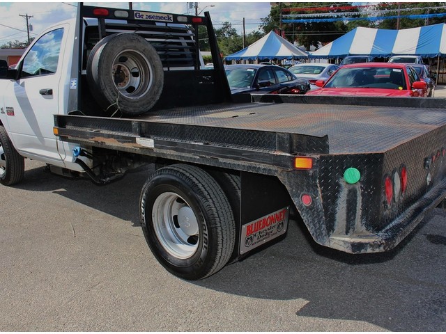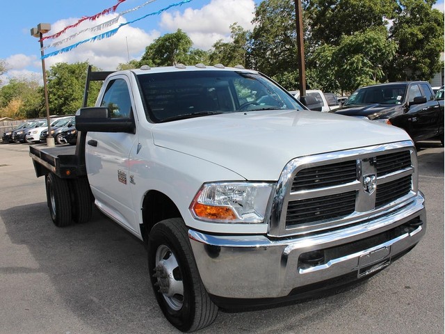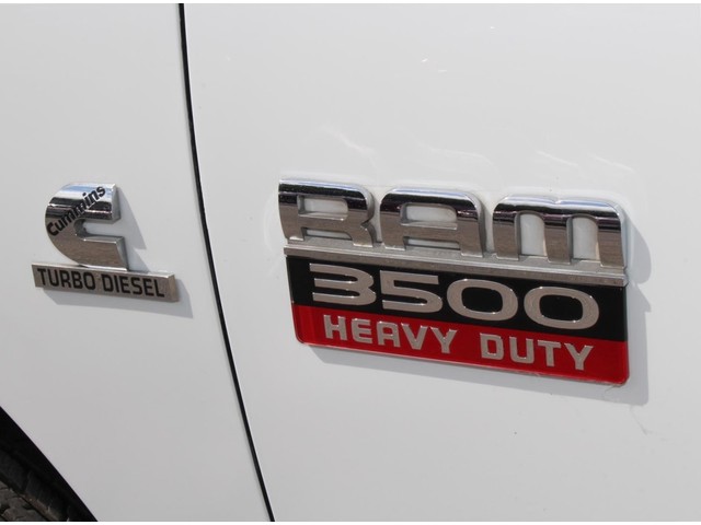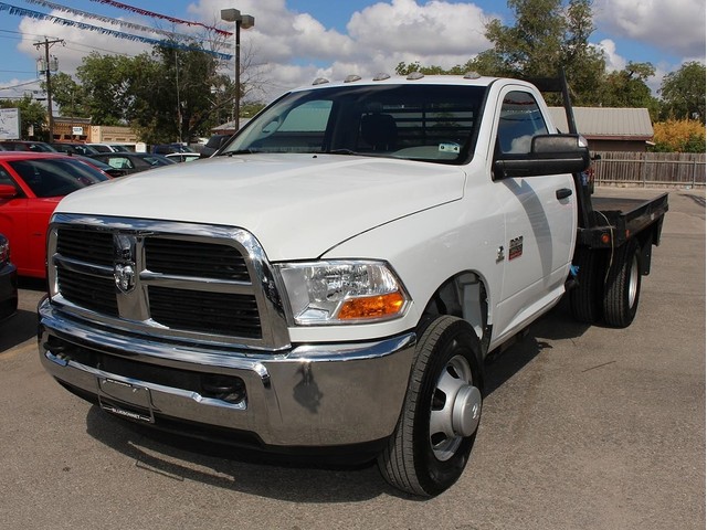 Purchase this rugged white 2011 Ram 3500 Heavy Duty Regular Cab & Chassis Dually pick up at a great deal. This utility truck features a Flat Bed, back rack, hitch, MP3, steel wheels, tow group, cruise control, & more! This is a smoke free Ram & the interior is absolutely free of rips, odors, or abuse. This vehicle's powerful 6.7 LTR I6 Turbo Diesel engine is in perfect working condition for excellent towing capacity! There are no noticeable dings on the exterior, & the shiny clean finish makes this used auto look like new. The tires have at least 3/4 of their life span left, & the mileage represented is 100% accurate. With a smooth shifting automatic transmission & all power equipment working properly, each job will be one of ease & pleasure!