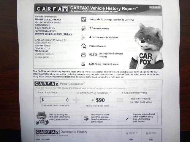 You are looking at a Gorgeous 1994 Mazda Miata Convertible with 55K Original Miles. This is a Very Rare Find in this condition! This Little Miata is a real beauty. This Miata has super-low original miles and has been babied its entire life. This Mazda has a Clean Carfax, Clean Autocheck, and Clean Florida Title. This is a rare find in this condition with such low miles. This car is a real head turner. It runs and looks awesome. This is a nice Generation 1 Miata that is completely stock mechanically. It's ready to go today! Need absolutely nothing. Please let us know if you have any questions or concerns regarding this vehicle. We are happy to help at any time. Please call Jeff or Ken at 954-561-2499 or email us at usedcars@suprememotorsfla.com.