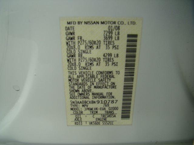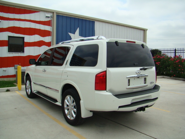 GREAT CONDITION. WELL MAINTAINED WITH INFINITI PARTS AND FLUIDS. NO ACCIDENTS OR PAINT JOB DONE. VERY RELIABLE AND STRONG. 5.6L V-8 PRODUCING 320 HP AND 396 FT-LBS OF TORQUE ENOUGH TO TOW 8900 LBS! 5 SPEED TRANSMISSION. IT IS LOADED WITH KEYLESS ENTRY, FRONT AND REAR PARKING SENSORS, BOSE NAVIGATION WITH BLUETOOTH AND BACKUP CAMERA, SATELLITE RADIO, HEATED FIRST AND SECOND ROW CAPTAIN SEATS, AUTOMATIC 3RD ROW SEATS AND LIFT GATE, BRIGHT XENON GAS LIGHTS WITH 3 DEGREE BEAM TILT AND REAR LEDs, 20" INCH WHEELS AND AN EXTREMELY SOFT RIDE.