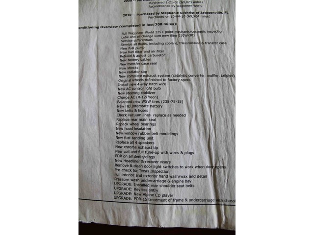 Hello and thanks for looking at our auction for this really nice rust free Grand Wagoneer. This Wagoneer was purchased 4 years ago @70k from The Wagon Master in TX. considered to be the authority on Wagoneers, it was purchasedby the 3rd owner for 29k it was given a full overhaul at that time .It has the full history from day one,all the original owners info etc. Purchased new in WA ,then sold to neighbors then to Wagonmaster whenre it was sold to a lady in FL who traded it in on a brand new Jeep at he local Jeep Chrysler dealer where we aquired it . The Jeep itself is still in excellent condition,as sen in the pics the hood is a little dull and it has had about 30k miles put on in in the last 4 years but its still in overall fantastic shape. The frame is rust free,wood is excellent,chrome is great.All power options work just as intended,all lights etc ,some wear on armrest(center) Please call direct or email for questions OR to make an offer any time we reserve the right to sell this car anytime if a reasonable offer is made . in FL we are required to collect state tax,tag and registration fees,the same price as they charge,we do charge a 99.00 dollar doc fee to cover this. If transported out of state we do not collect sale tax-we can hel you arange shipping but are not responsible for shipping delays. we are a small wholesaler here in Central Fl Orlando 10 miles from airport we have been here 14 years,we keep most of these cars in storage so if you are local please call to schedule a viewing. call us anytime @ 407-595-9207 RANDOLPH, I am the owner and hand pick all the cars and can answer all questions ,look foward to chatting . | | |