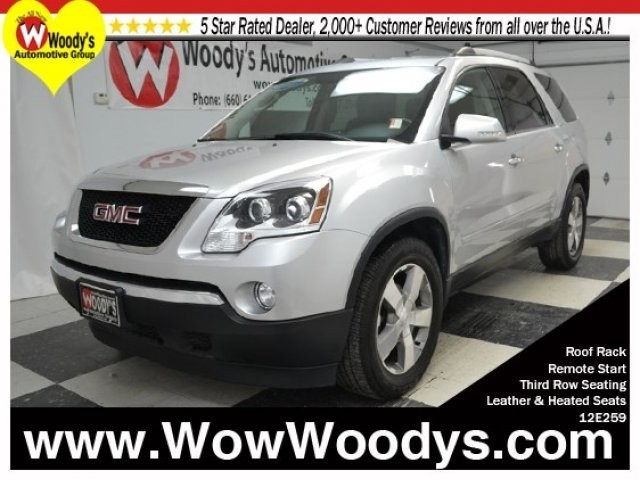 Family friendly! 2012 GMC Acadia SLT AWD 3.6L V6 Leather & Heated Seats, CD Stereo w/Aux, Remote Start, Alloy Wheels, Roof Rack, Backup Camera, Backup Sensor, Dual Zone Climate Control, Leather Steering Wheel, Third Row Seating, Quad Seating, Certified Warranty. Extremely sharp! What a looker! Who could say no to a simply outstanding SUV like this superb 2012 GMC Acadia? This plush Acadia, with grippy AWD, will handle anything mother nature decides to throw at you during one of her bad days at work.Price includes $500 instant rebate when financed through a Woody's Lender.Want a custom video? Just text your name and the stock# to 660-247-5319.This vehicle's stock# 12E259-190Click here to read why we're different! Woody's is an Honest, Up-Front, One Price Dealership selling used cars in the greater Kansas City area. Check out what over 1000 customers are saying at wowwoodys.com When it comes to Price, we're third party verified among the lowest In The Nation! This vehicle is certified with a *Pre-Owned Warranty* at no cost to you! Not sure which vehicle you want? With the largest, most diverse inventory in Middle America you can view all makes in one location! Check out our website to see 800+ vehicles with Free Carfax Reports, 50+ Pictures, Videos and more! www.wowwoodys.comThe majority of our vehicles qualify for Woody's Assurance Program which includes a 12 Month Return Policy, Limitations Apply, See Dealer for Details.Some of our customers say, Help me find a car or just find me a car We can find you any used car, used truck, used suv. Plus, We will pick you up at the airport or ship your vehicle to you! Our award winning Finance Management Team works with over 15 local and national banks to get you the best rate and term. If you would like to save time just visit our wowwoodys.com website to access our Online Secure Credit Application. We also offer an online payment calculator so you can setup different down payment/monthly payment options.For more great vehicles like this one, check out ** http://www.wowwoodys.com/inventory/newsearch/Used/ **[Image] 3rd Row Seat 4-Wheel Disc Brakes 4-Wheel drive ABS AM/FM Stereo Adjustable Steering Wheel Air conditioning rear manual All Wheel Drive All wheel drive Alloy Wheels Alternator 170 amps Aluminum Wheels Audio system controls rear with headphone jacks Audio system feature USB port-receptacle Auto-Dimming Rearview Mirror Automatic Crash Response Automatic Headlights Auxiliary Audio Input Axle 3.16 ratio Back-Up Camera Bluetooth Connection Brakes 4-wheel antilock 4-wheel disc Bucket Seats CD player Center Console Child Safety Locks Climate Control Cruise control Cup Holders Cup holders 2 front on the floor console Cup holders 2 in the second row Daytime Running Lamps Daytime Running Lights Defogger rear-window electric Door locks rear child security Driver Adjustable Lumbar Driver Air Bag Driver Illuminated Vanity Mirror Driver Vanity Mirror Engine Immobilizer Exhaust double dual with chrome tips Floor Mats Fog Lamps Front Head Air Bag Front Reading Lamps Front Side Air Bag Heated Front Seat(s) Heated Mirrors Heated Seats HomeLink Horn dual-note Insulation acoustical package Integrated Turn Signal Mirrors Intermittent Wipers Keyless Entry Leather Steering Wheel | Leather seats MP3 Player Mirror inside rearview auto-dimming Multi-Zone A/C Navigation from Telematics Passenger Adjustable Lumbar Passenger Air Bag Passenger Air Bag Sensor Passenger Illuminated Visor Mirror Passenger Vanity Mirror Power Door Locks Power Driver Seat Power Liftgate Power Lumbar Support Power Mirror(s) Power Mirrors Power Passenger Seat Power Steering Power locks Power seats Power windows Premium Sound System Privacy Glass QUICKSILVER METALLIC RECLINING FRONT BUCKETS (STD) Rear A/C Rear Bucket Seats Rear Defrost Rear Head Air Bag Rear Park Assist Rear Parking Aid Rear Reading Lamps Rear Seat Audio Controls Rear Spoiler Remote Engine Start Remote Trunk Release Remote vehicle start Satellite Radio Seat trim leather-appointed Ski/Storage Rack Stability Control Steering power variable effort Steering Wheel Audio Controls Steering Wheel Controls Stolen Vehicle Assistance Storage system rear cargo area under floor Suspension Ride and Handling Telematics Third Row Seat Tire Pressure Monitor Tires - Front All-Season Tires - Rear All-Season Traction Control Universal Garage Door Opener V-Style Engine Windows power with driver Express-Down |